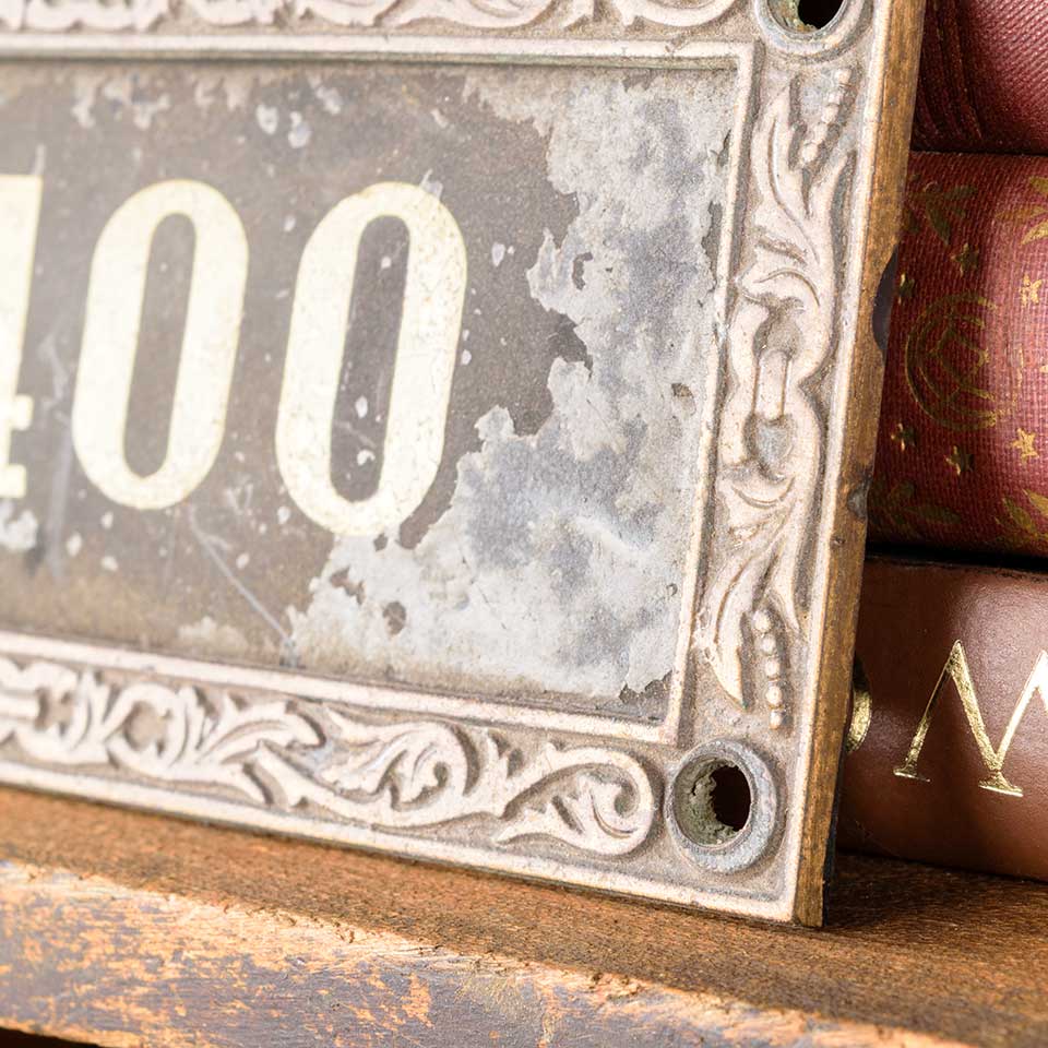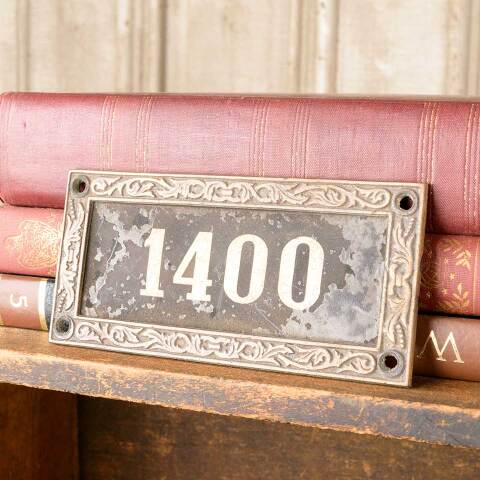 Architectural salvage antique brass frame with removable number 1400 plaque measuring approx. 5 1/2" wide x 2 3/4" tall x 1/8" front to back. See photos to evaluate condition.