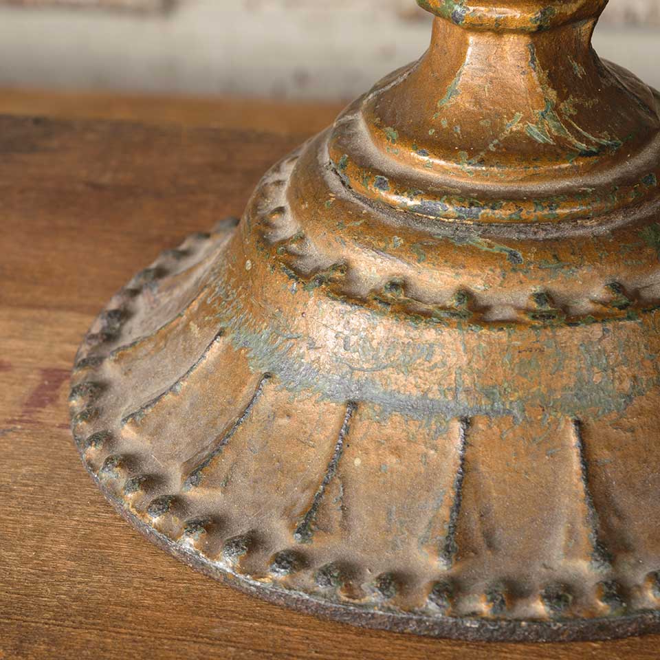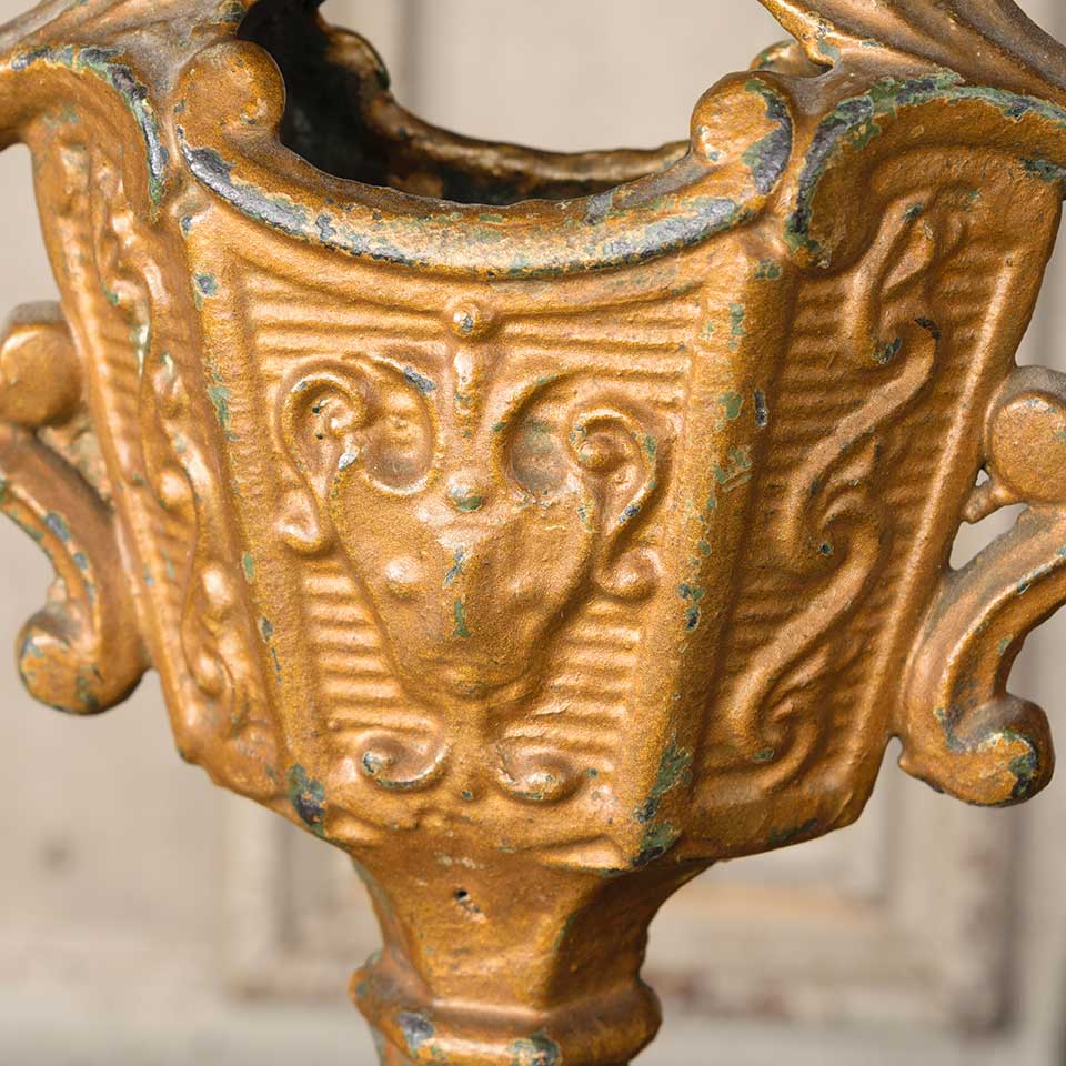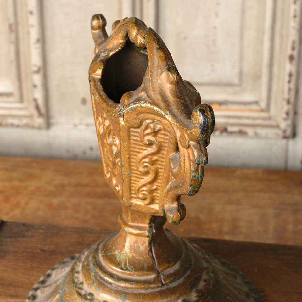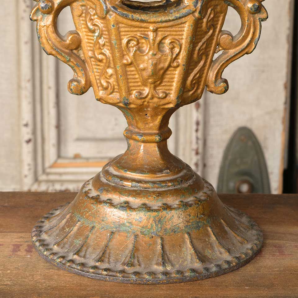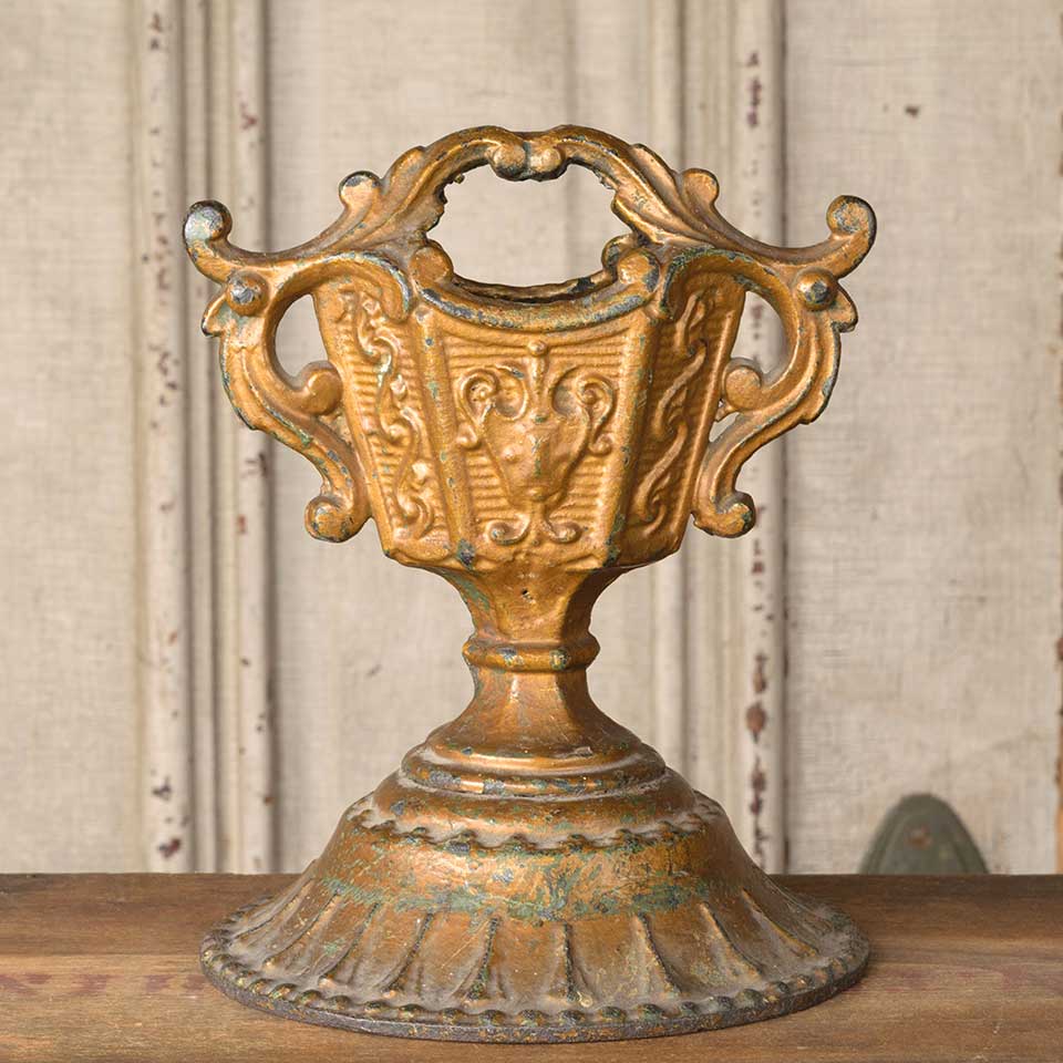 Architectural salvage antique ornate cast iron ornamental finial measuring approx. 6 3/8" wide x 7 3/4" tall x 1 7/8" front to back with a 6 1/4" diameter base. See photos to evaluate condition.