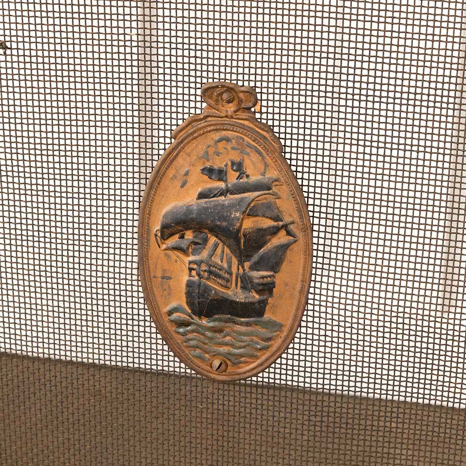 Architectural salvage large freestanding antique metal fireplace screen with nautical motif measuring approx. 72" wide (73 3/4" including feet) x 36 1/8" tall x 8 1/4" front to back (overall). See photos to evaluate condition.