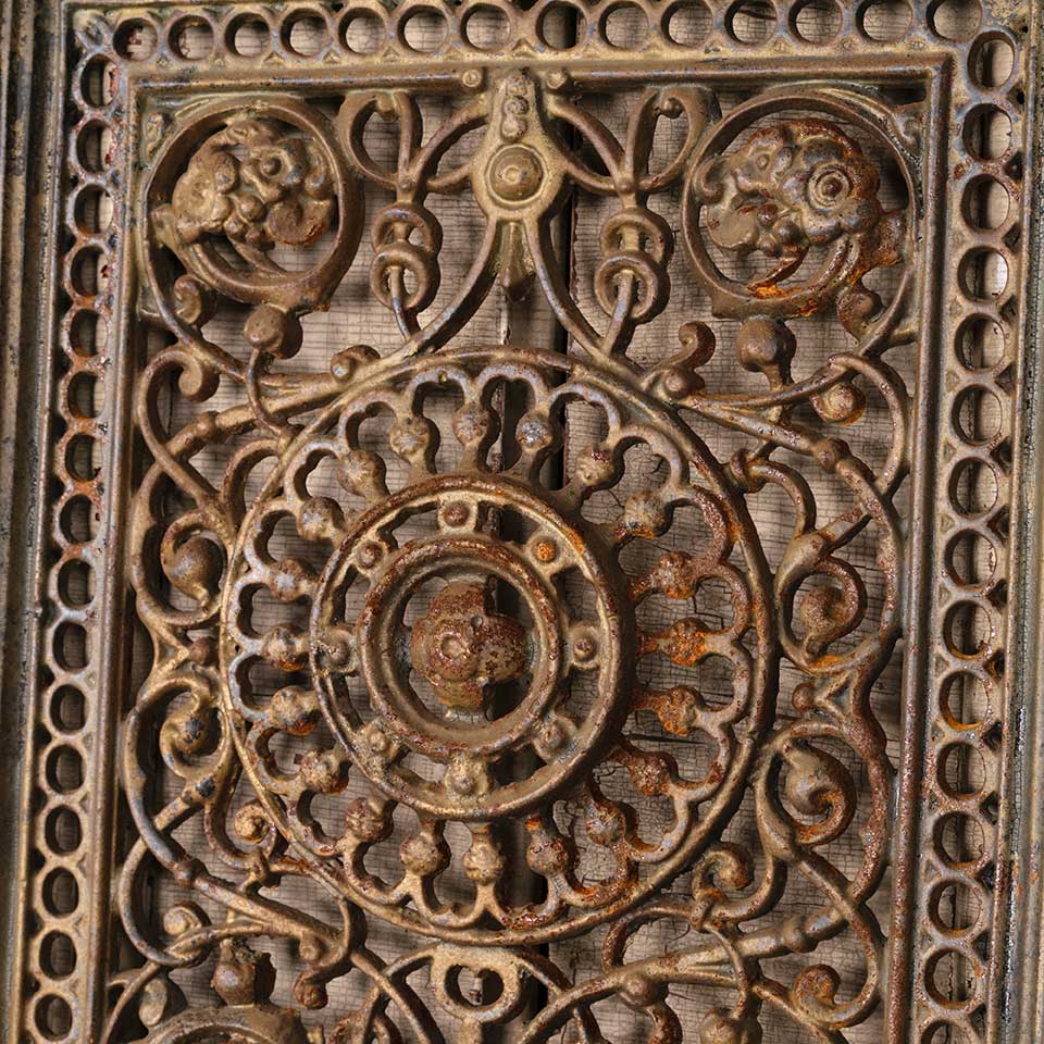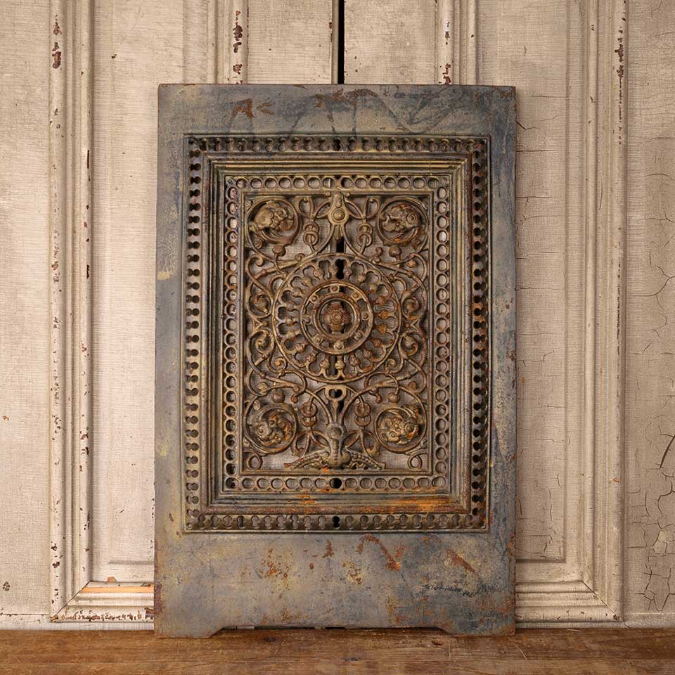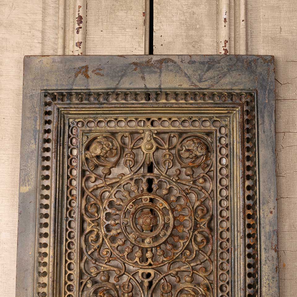 Architectural salvage antique ornate cast iron fireplace summer front cover measuring approx. 18 1/8" wide x 27 3/4" tall x 1" front to back. See photos to evaluate condition.
