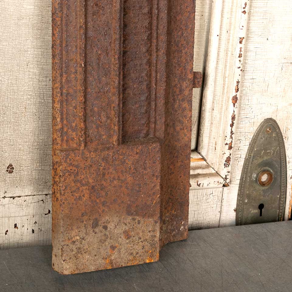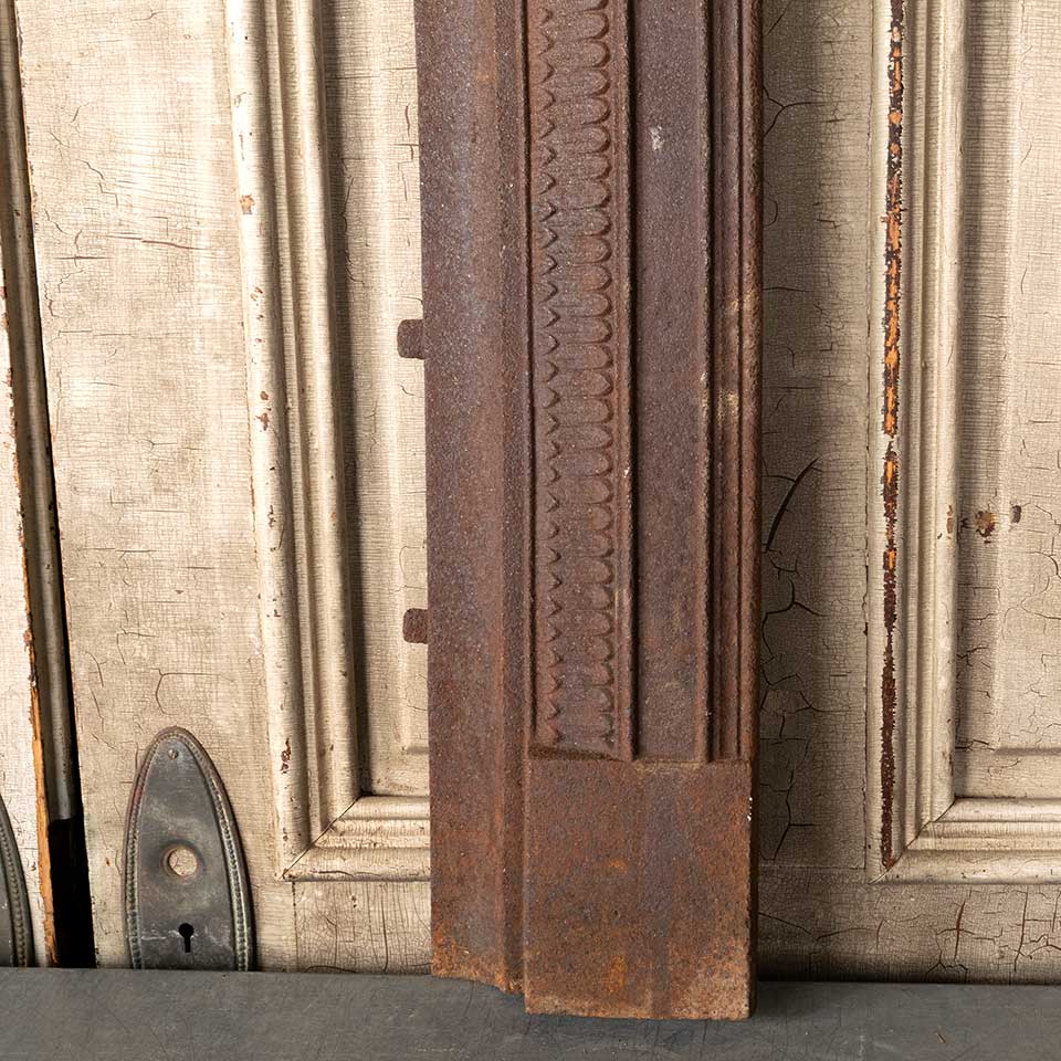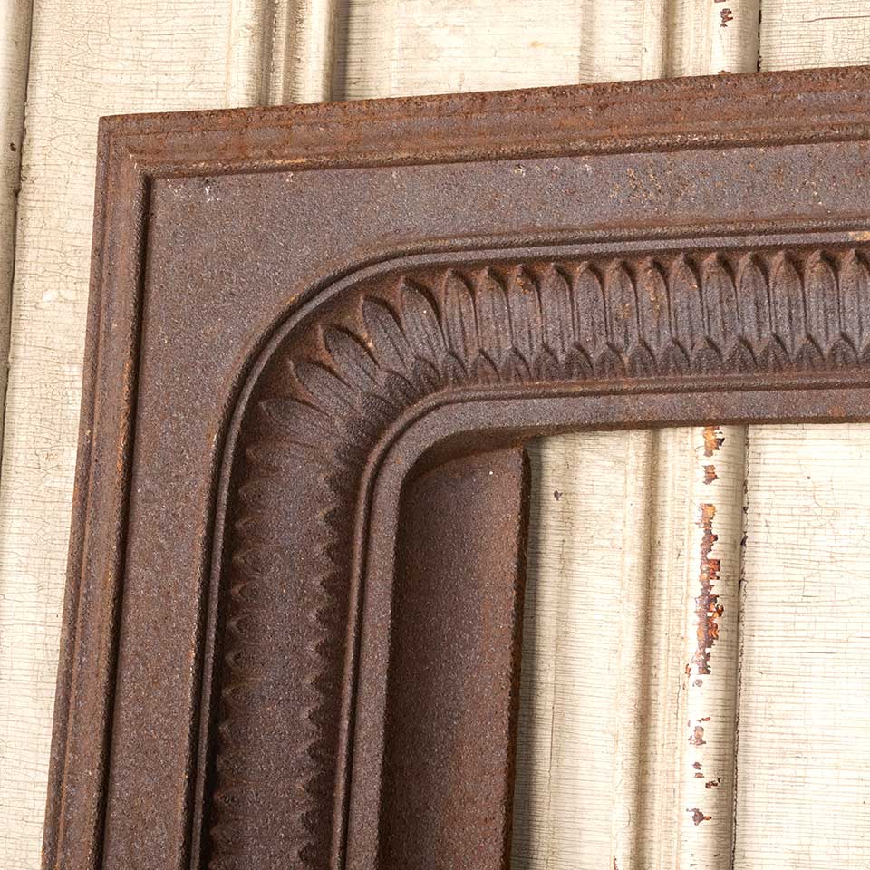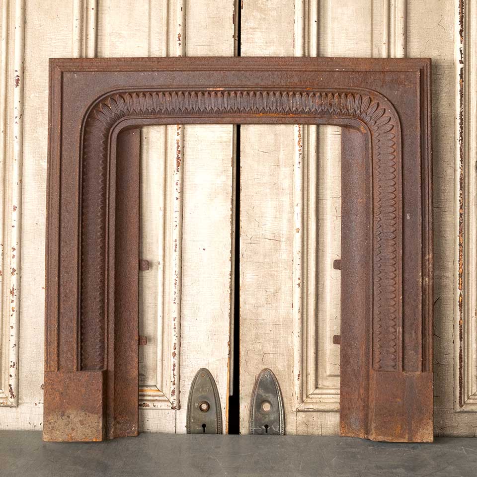Architectural salvage antique cast iron fireplace surround measuring approx. 32 3/4" wide x 32 3/8" tall x 3" front to back. The interior firebox opening measures approx. 17 1/2" wide x 26 3/4" tall. See photos to evaluate condition.