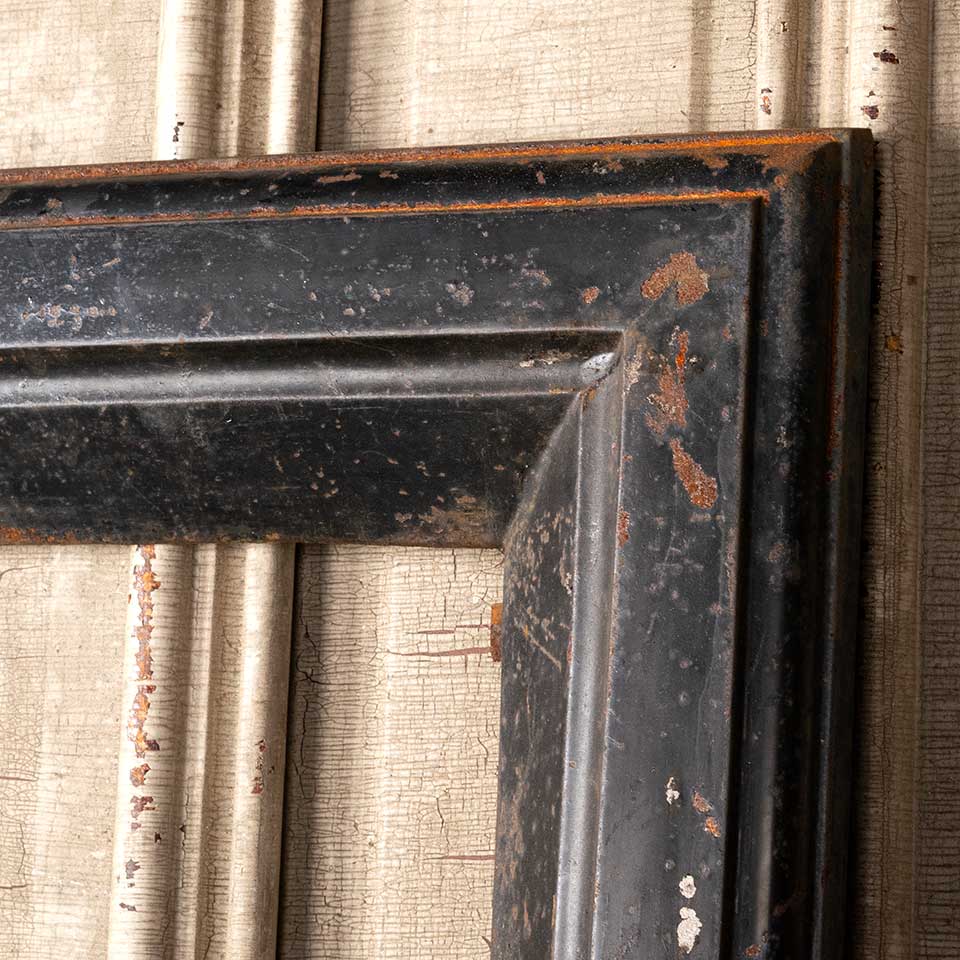 Architectural salvage antique cast iron fireplace surround measuring approx. 29" wide x 31 7/8" tall x 2" front to back. The interior firebox opening measures approx. 20 3/8" wide x 27 1/4" tall. See photos to evaluate condition.