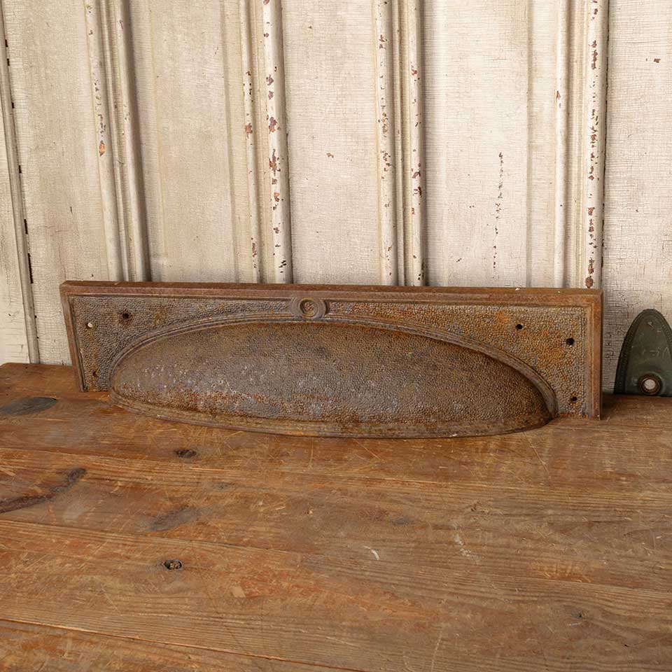 Architectural salvage antique cast iron fireplace surround hood measuring approx. 24 5/8" wide x 5 3/8" tall x 3 1/2" front to back. See photos to evaluate condition.