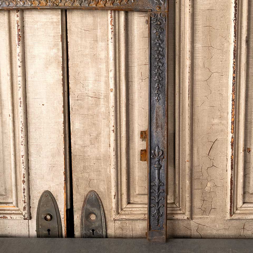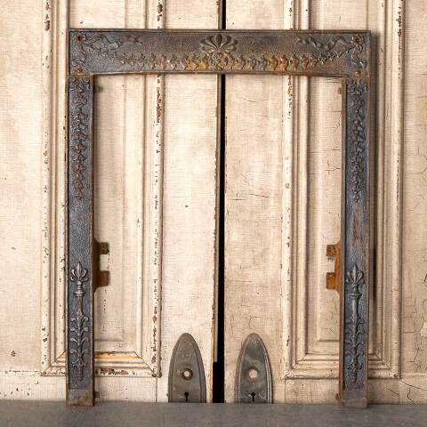 Architectural salvage antique cast iron fireplace surround measuring approx. 24 1/2" wide x 30 1/4" tall x 2" front to back. The interior firebox opening measures approx. 19 3/4" wide x 26 1/4" tall. See photos to evaluate condition.