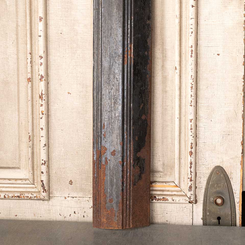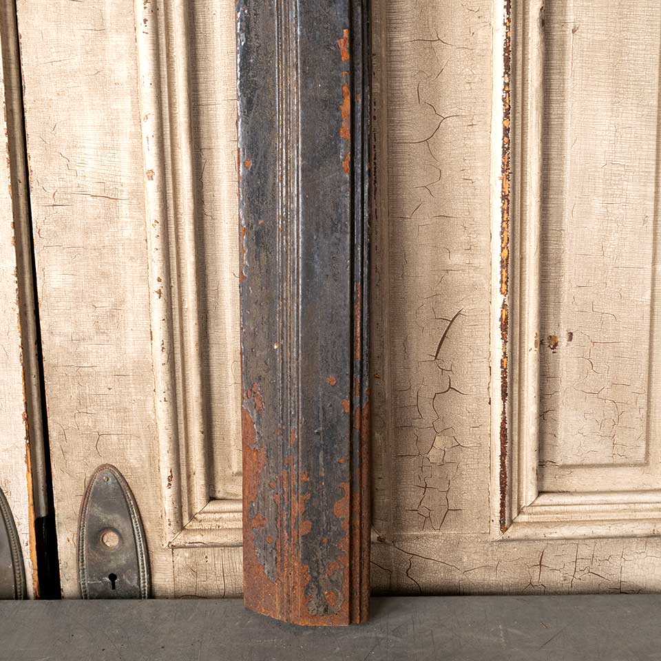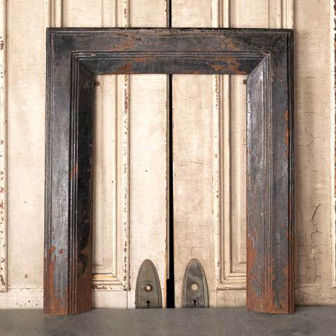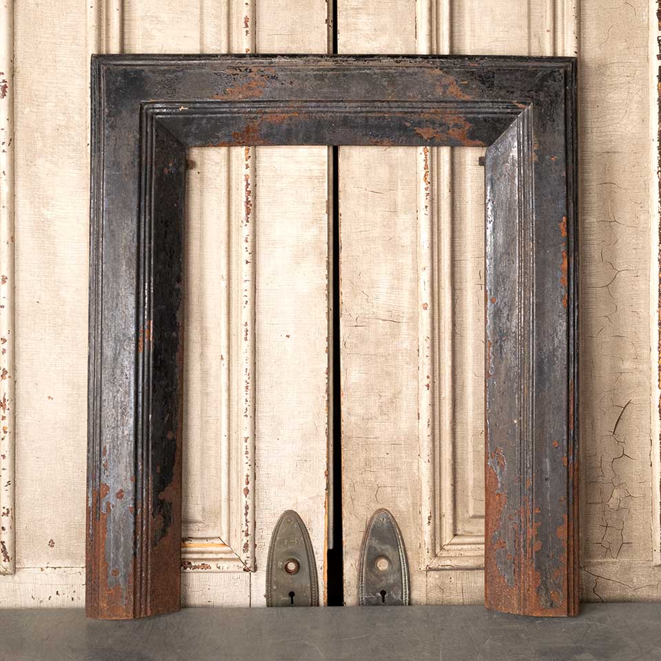 Architectural salvage antique cast iron fireplace surround measuring approx. 28 1/4" wide x 32 3/8" tall x 2 1/4" front to back. The interior firebox opening measures approx. 17 3/4" wide x 27" tall. See photos to evaluate condition.