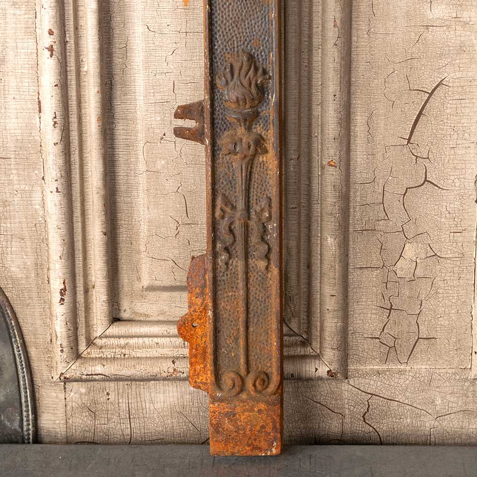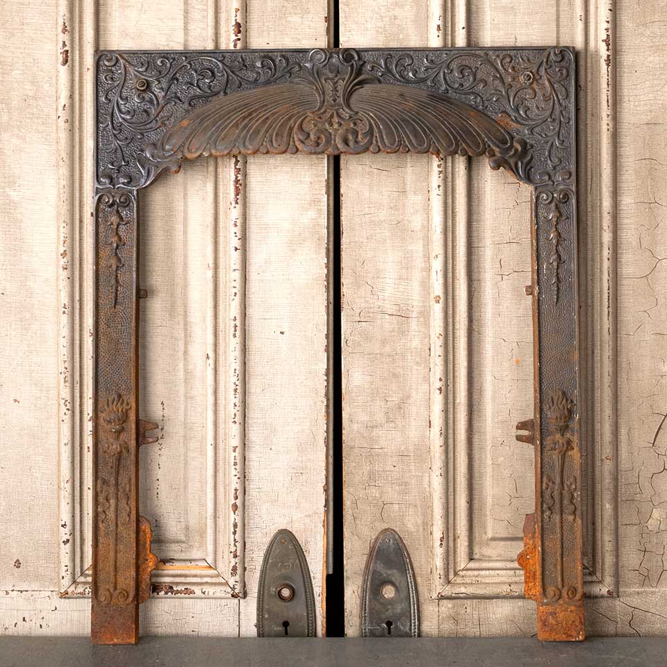 Architectural salvage antique cast iron fireplace surround measuring approx. 25" wide x 30 3/4" tall x 3 1/4" front to back. The interior firebox opening measures approx. 20 1/2" wide x 25" tall. See photos to evaluate condition.