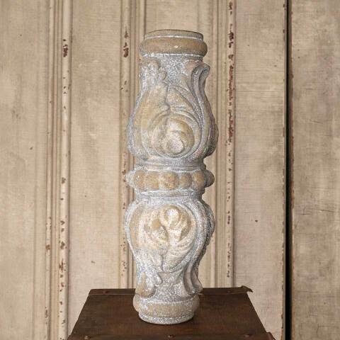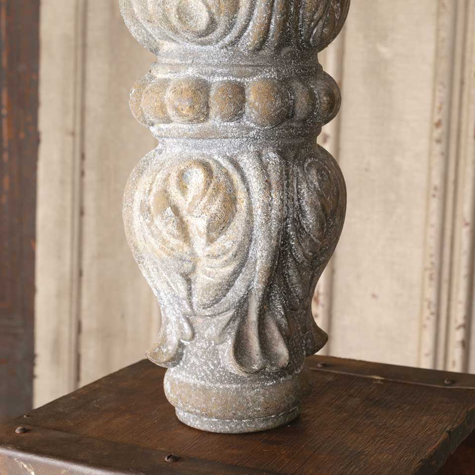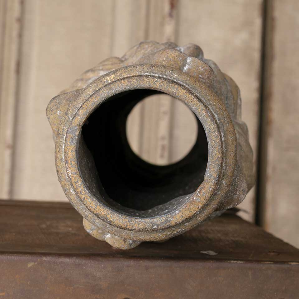 Architectural salvage antique ornamental metal remnant measuring 4 1/2" in diameter x 12" tall with a 2" diameter opening on both ends. See photos to evaluate condition.