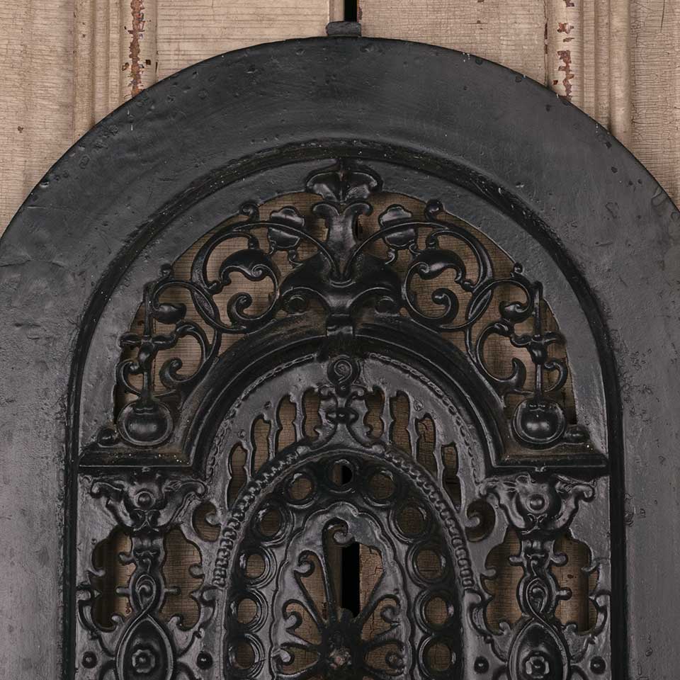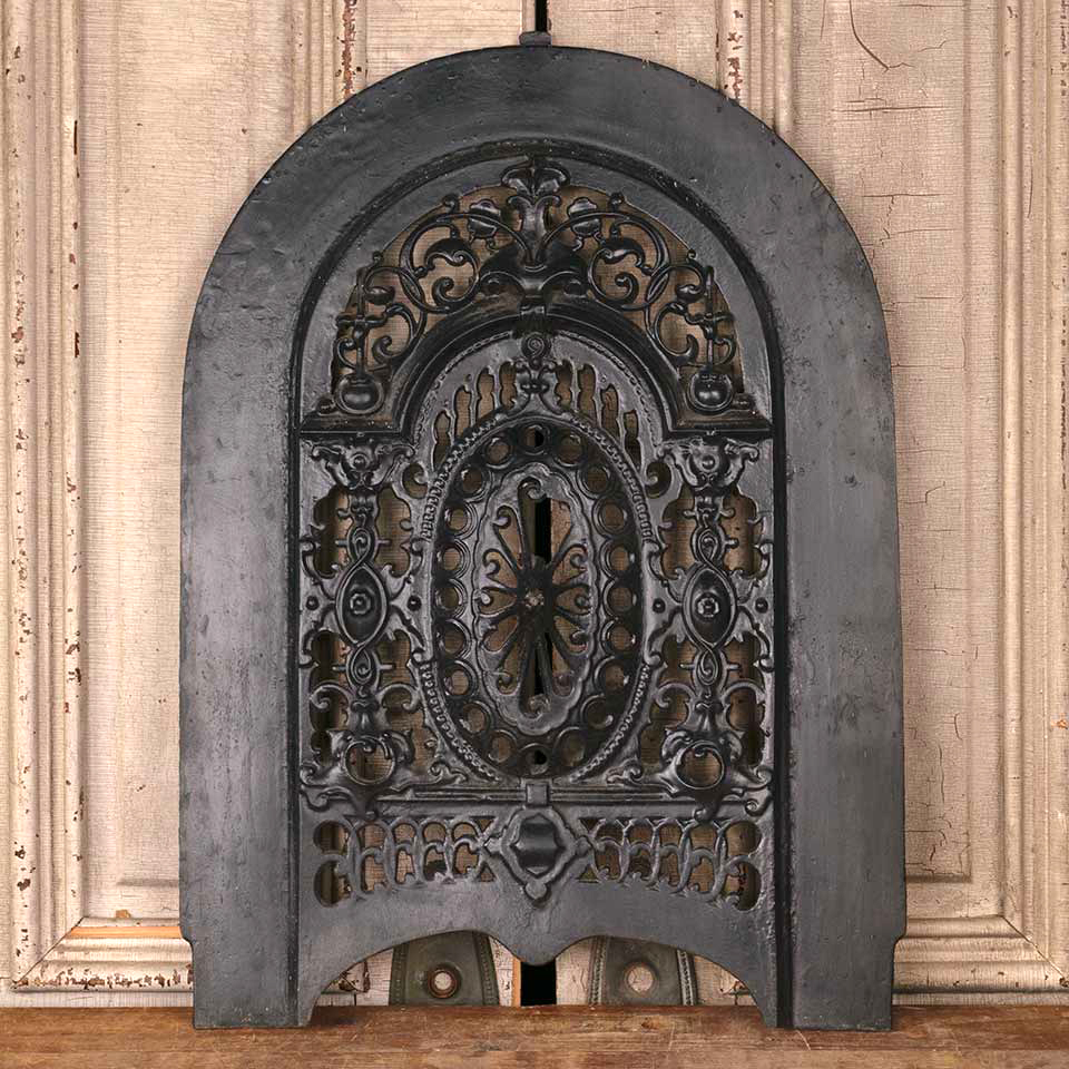 Architectural salvage antique ornate arched top cast iron fireplace summer front cover measuring approx. 19 7/16" wide x 26 1/2" tall x 2" front to back. There looks to be a piece missing from the center medallion. See photos to evaluate condition.