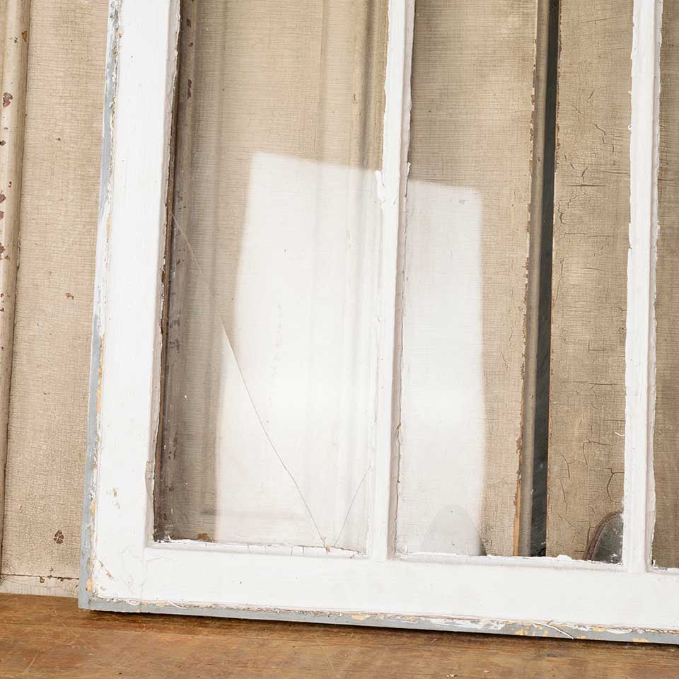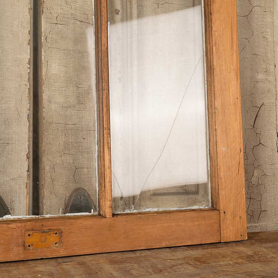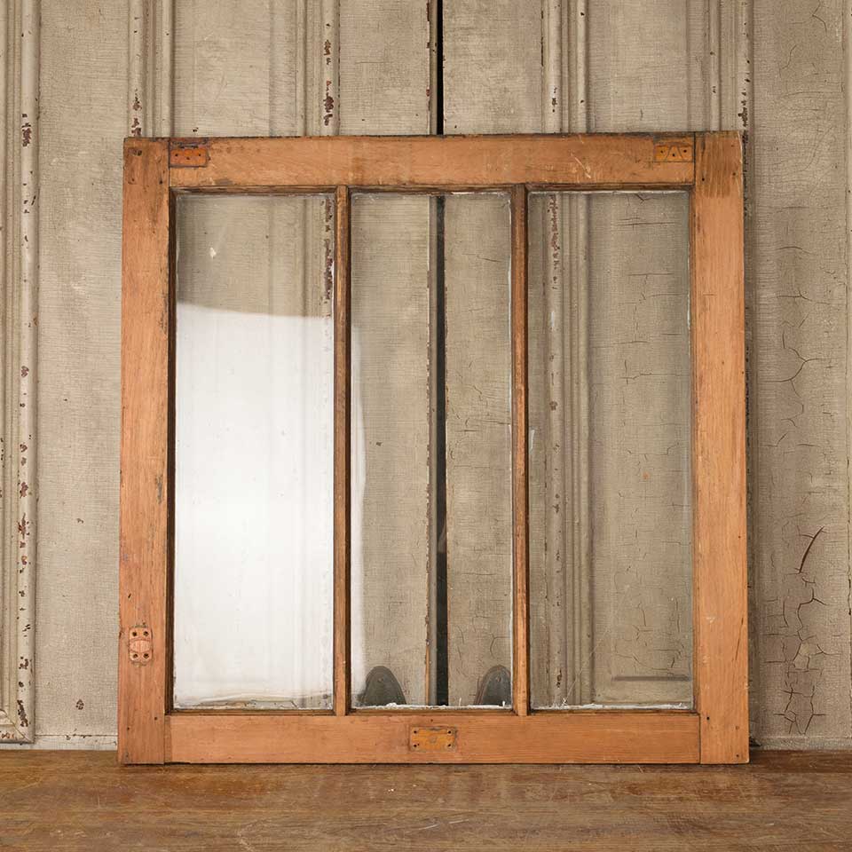 Architectural salvage antique divided three lite wood window sash measuring approx. 28 3/8" wide x 28 1/2" tall x 1 3/8" thick. There's one cracked pane. See photos to evaluate condition.