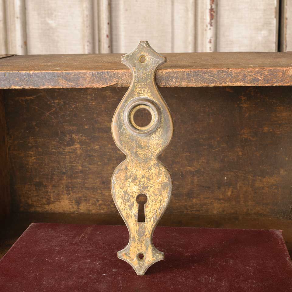 Architectural salvage antique brass doorknob backplate hardware measuring approx. 1 3/4" wide x 6 1/2" tall with a 3/4" collar. Spindle and keyholes measure 2 1/2" on centers. Color and condition vary, see photos to evaluate. Priced at $20/each.