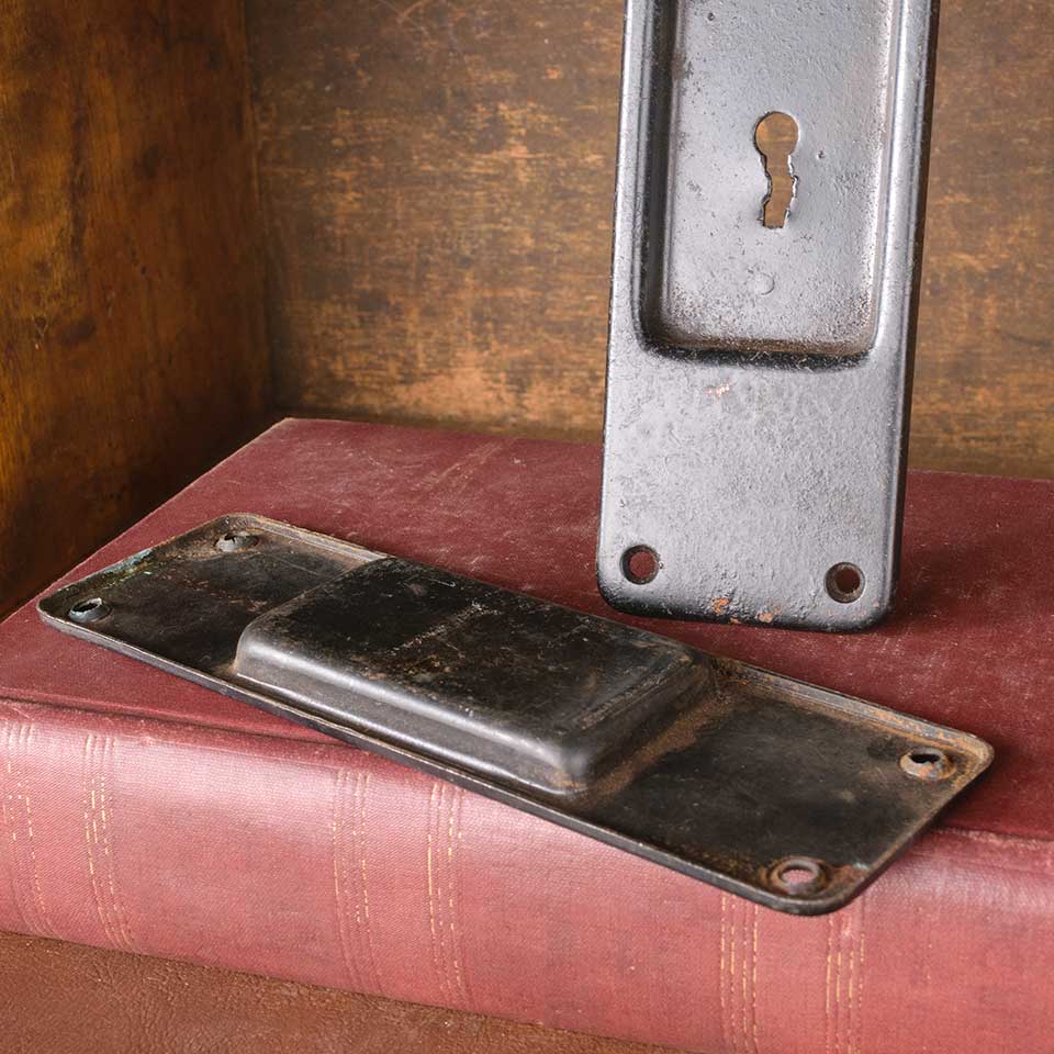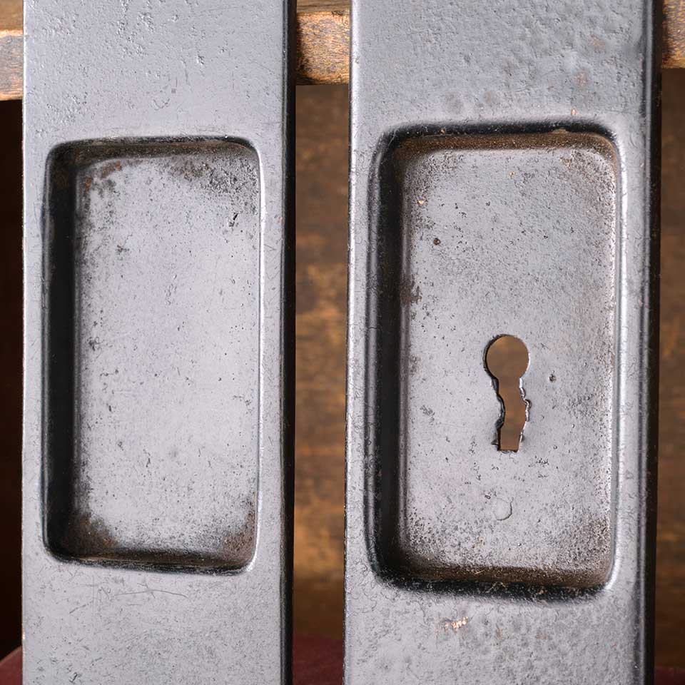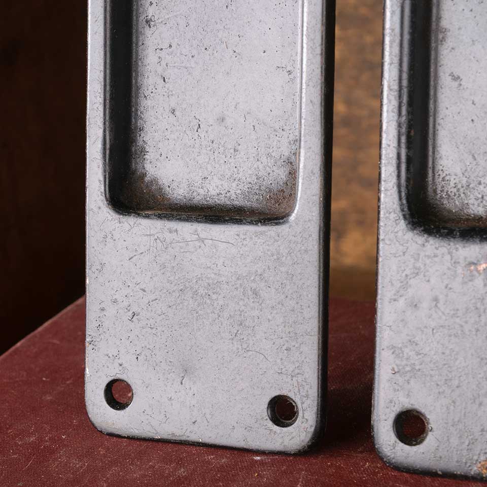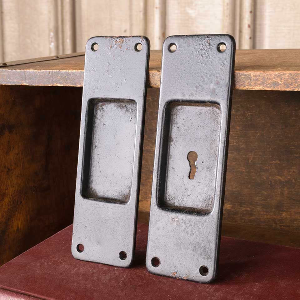 Pair of architectural salvage antique metal pocket door hardware pulls each measuring approx. 2 /8" wide x 6 5/8" tall with a recessed area 1 5/8" wide x 3" tall (1 plate with keyhole & 1 without). See photos to evaluate condition. Priced at $95 for the pair.