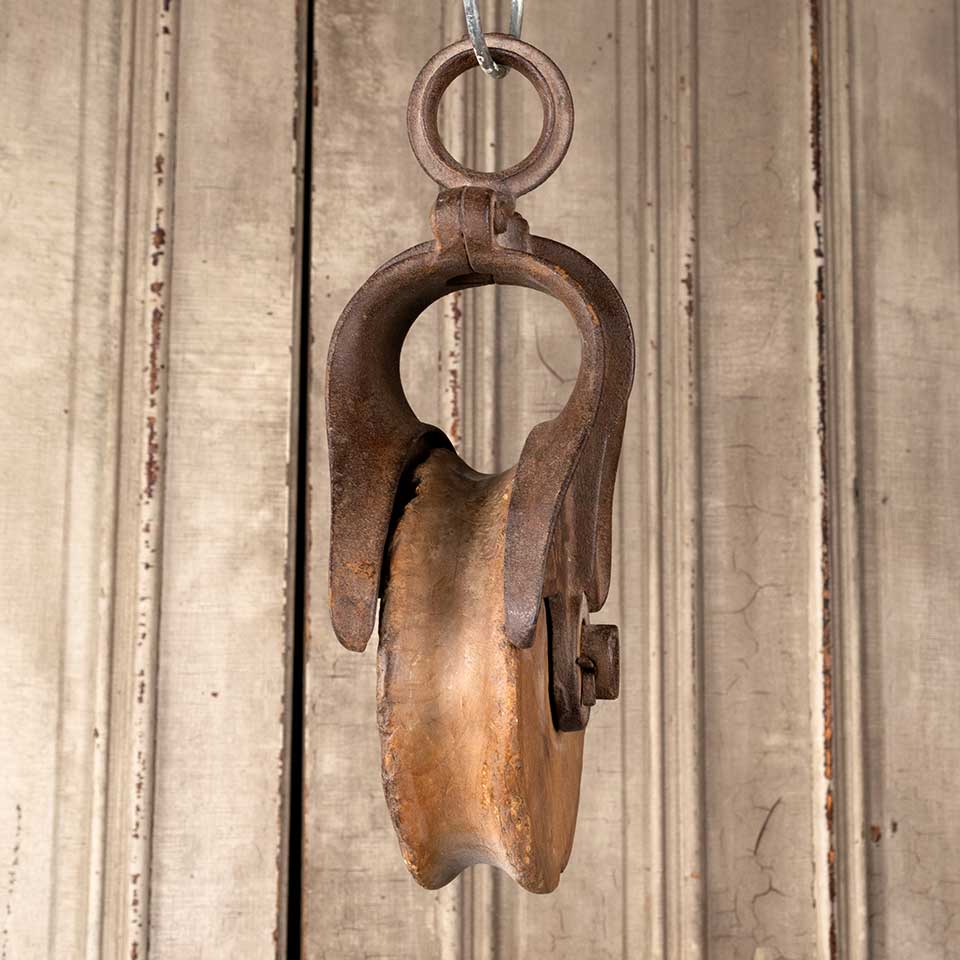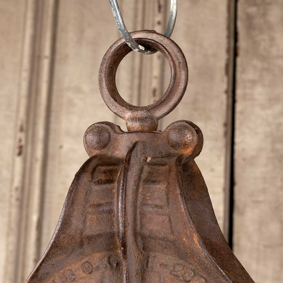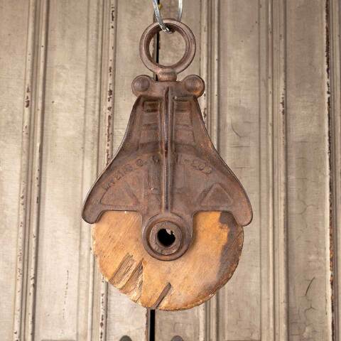 Architectural salvage antique cast iron and wood barn pulley measuring approx. 6 3/8" wide x 11 1/2" tall x 4" front to back. Marked "MYERS O.K. H-288". See photos to evaluate condition.