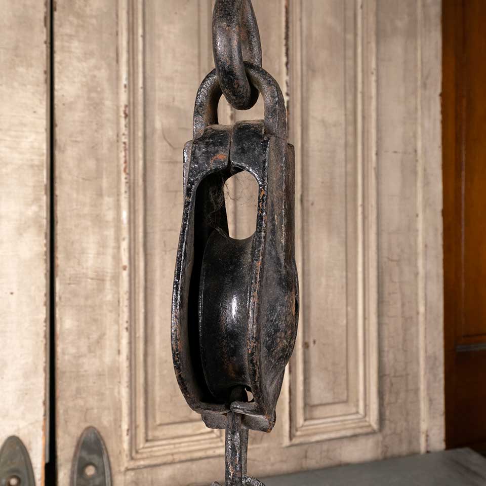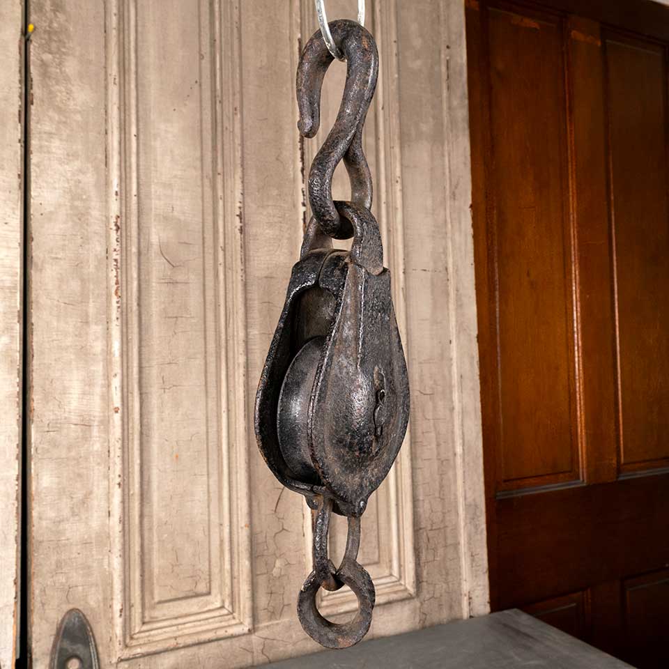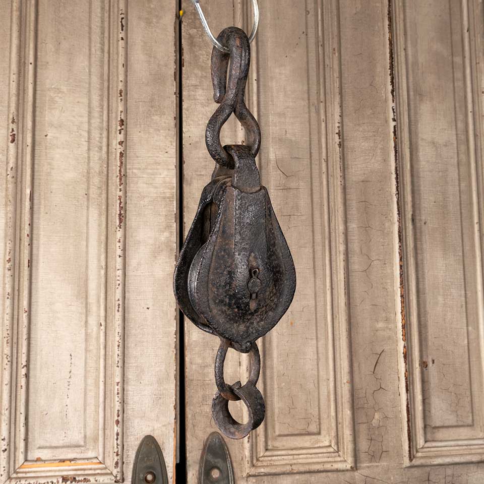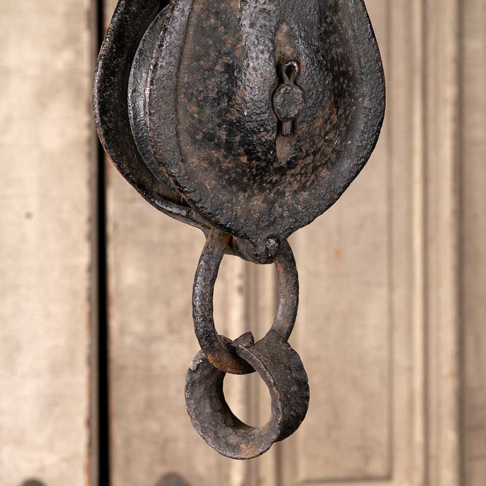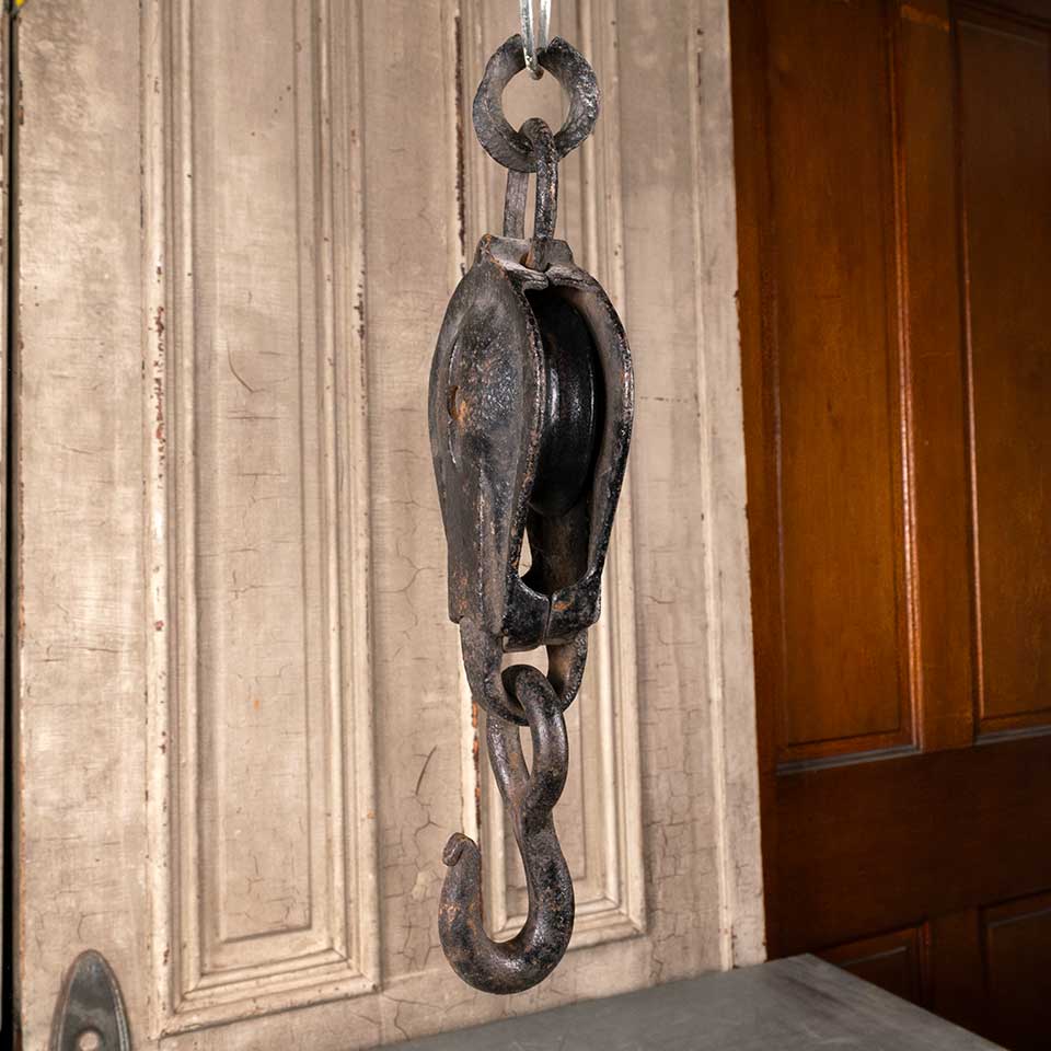 Architectural salvage antique cast iron barn pulley measuring approx. 4" wide x 13 3/4" tall x 2 1/4" front to back. See photos to evaluate condition.