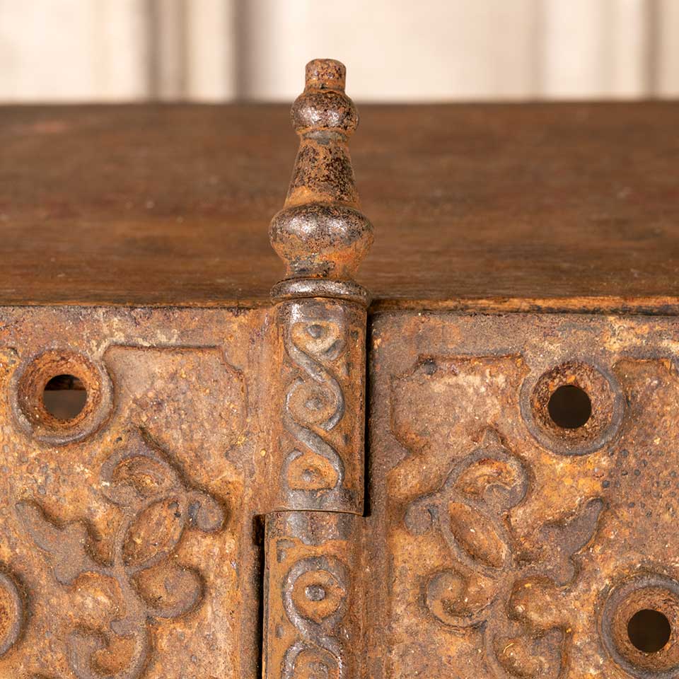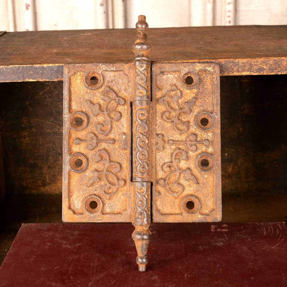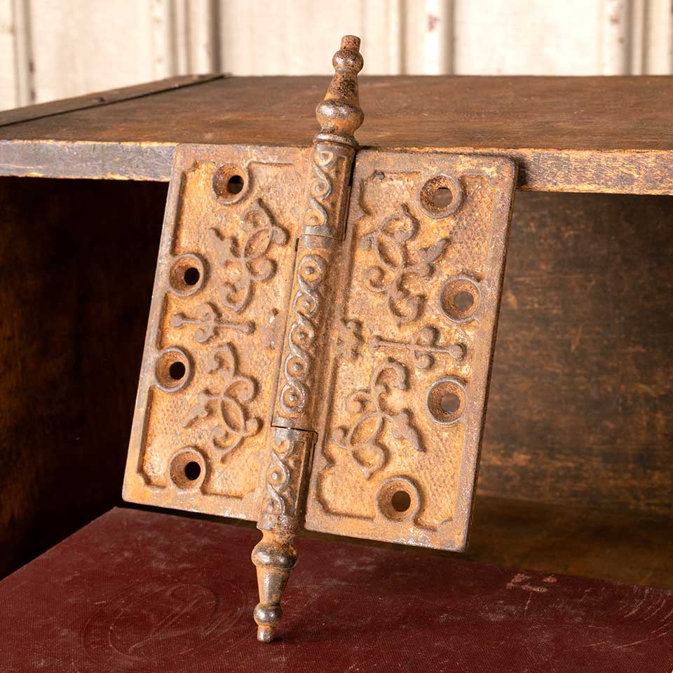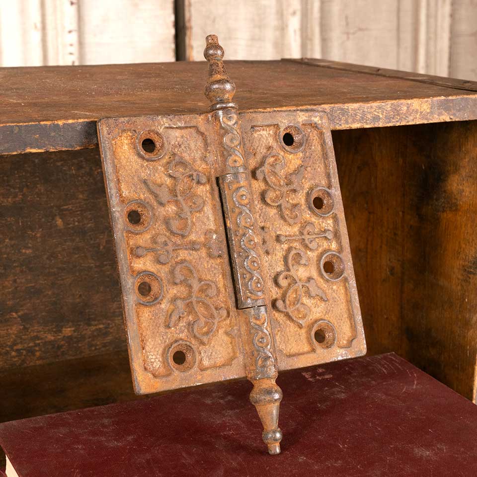 Architectural salvage antique ornate cast iron door hinge hardware with steeple finials measuring approx. 4 1/2" square (7 1/4" tall including finials). See photos to evaluate condition.
