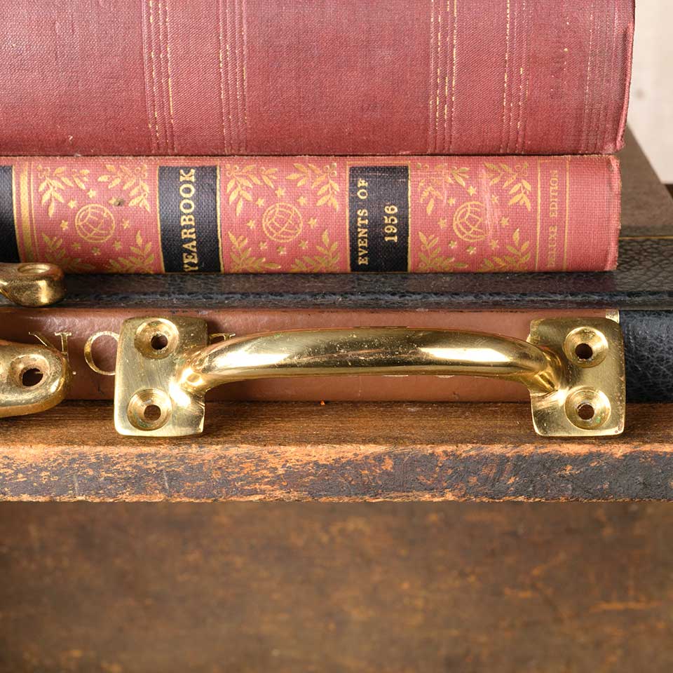 Architectural salvage solid brass double hung window sash lock and keeper and sash lift handle hardware set. Lock measures 2 1/2" x 3/4" x 1 1/8"; keeper measures 2 1/2" x 1" x 5/8"; and sash handle measures 4 1/8" x 1" x 1". Color and condition may vary. Priced at $25/three piece set.