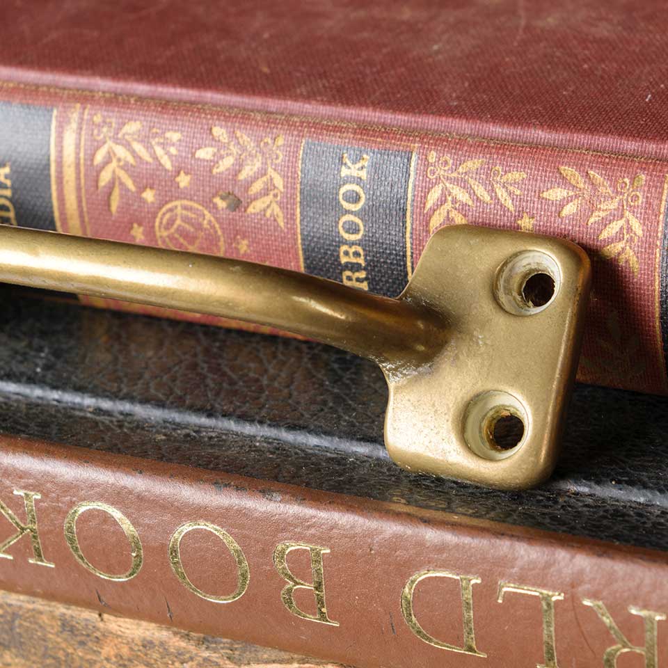 Architectural salvage solid brass double hung window sash lock and keeper and sash lift handle hardware set. Lock measures 2 1/2" x 3/4" x 1 1/4"; keeper measures 2 1/2" x 1" x 5/8"; and sash handle measures 4 1/8" x 1" x 1 1/8". Color and condition may vary. Priced at $25/three piece set.