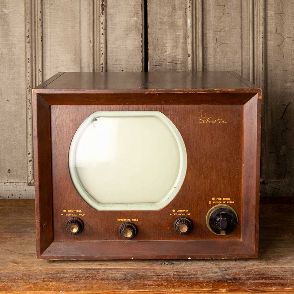 Antique wood cased Silvertone television set measuring approx. 18 7/8" wide x 14 1/2" tall x 20 3/16" front to back. See photos to evaluate condition.