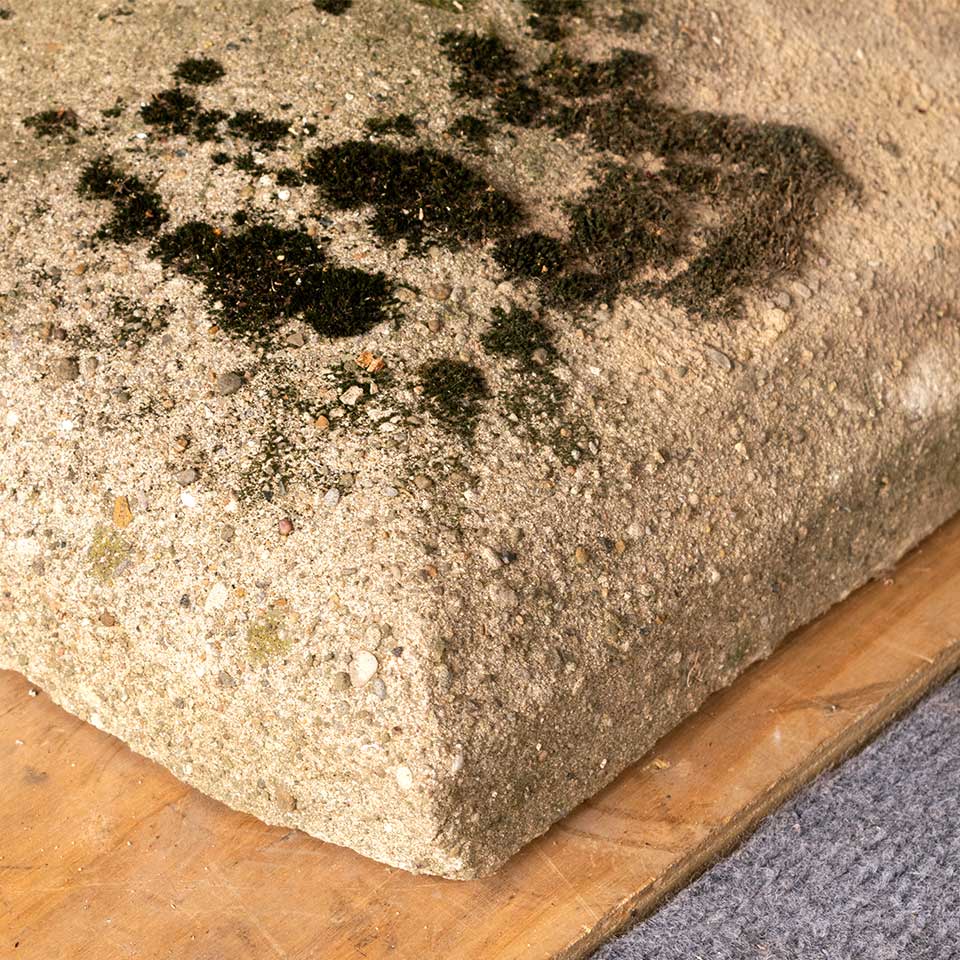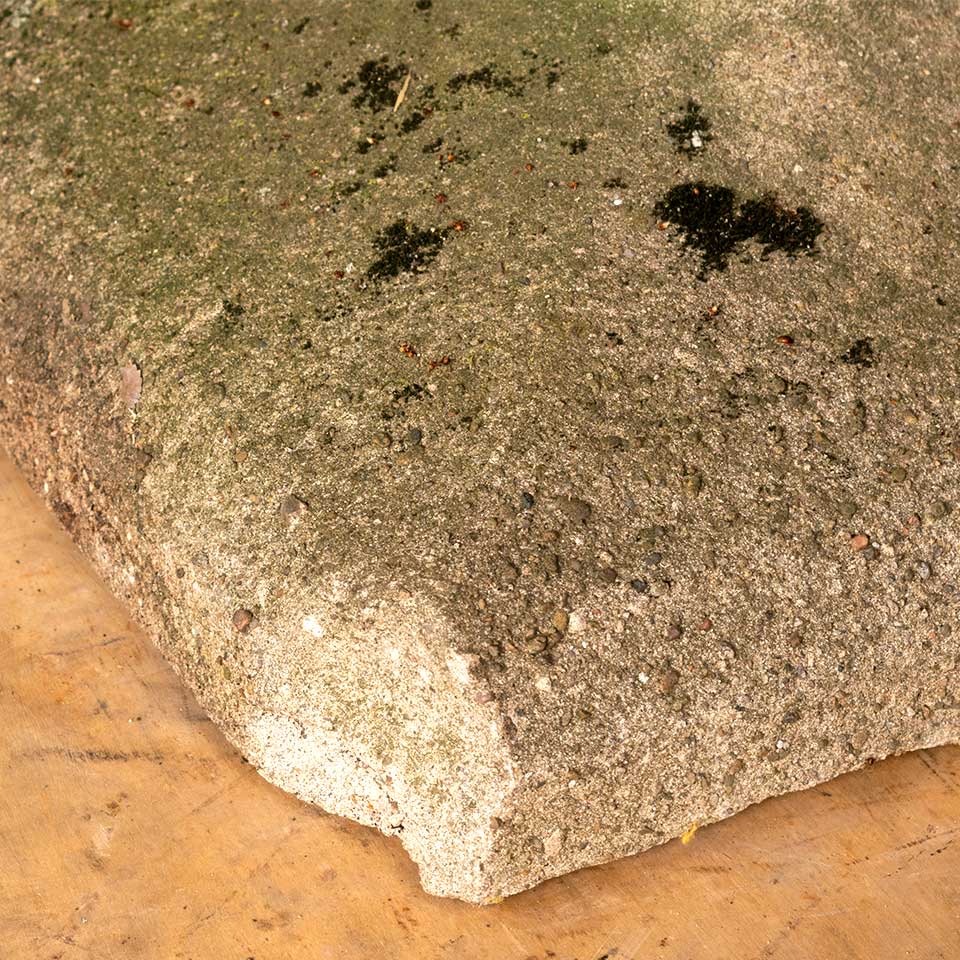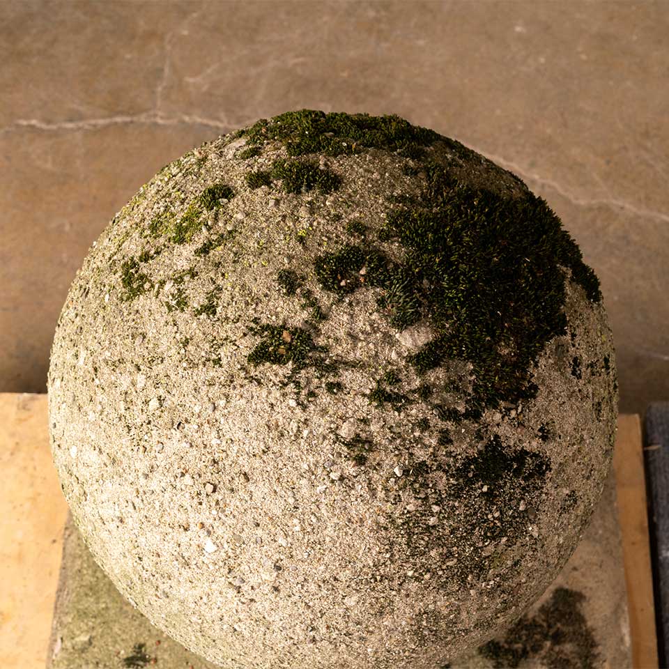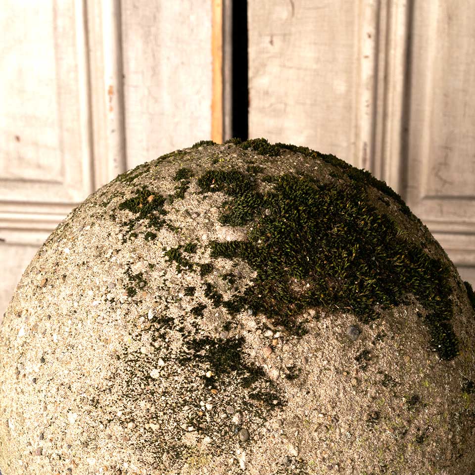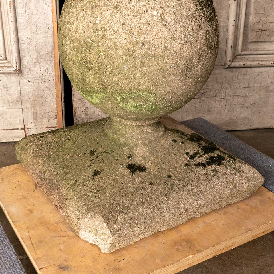 Architectural salvage vintage cast concrete garden finial measuring approx. 12" in diameter x 18 1/2" tall with a 16" x 16" base. One of the corners has material loss. See photos to evaluate condition.