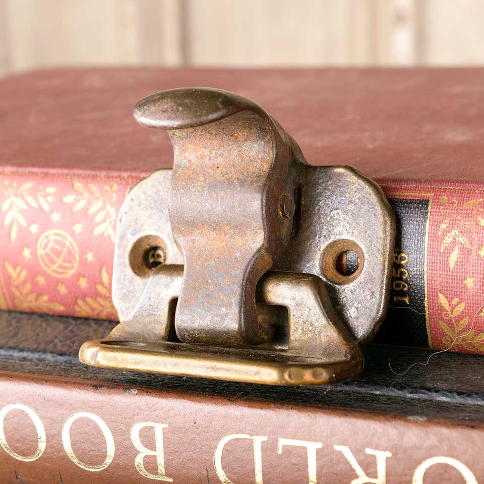 Architectural salvage antique cast iron window sash lift and lock hardware set. The lift / lock measures approx. 2" wide x 1 1/2" tall x 1 1/4" front to back. The keeper measures approx. 1 3/4" wide x 5/8" front to back. Color and condition may vary. Priced at $30/set.