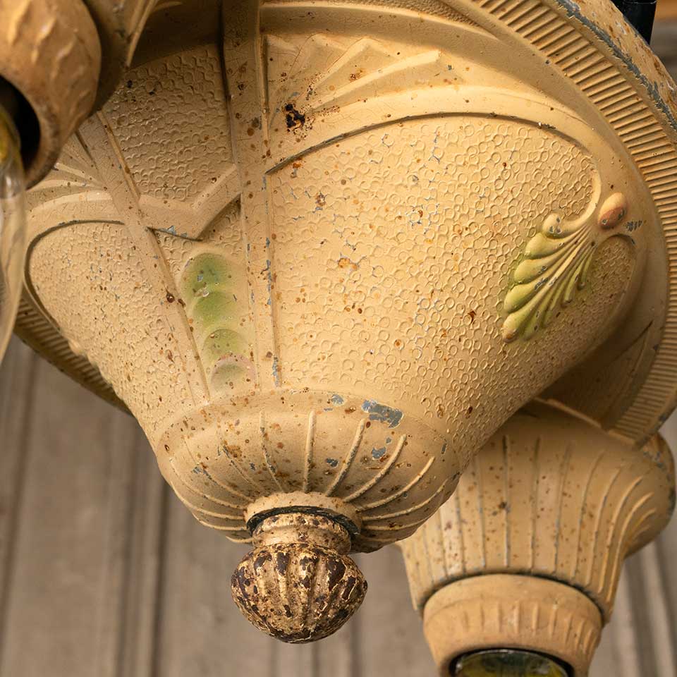Architectural salvage antique cast metal 2 bulb ceiling light fixture measuring approx. 12 3/8" wide x 6 1/2" front to back with a 3 3/4" drop. See photos to evaluate condition. Salvaged lighting should be inspected by a licensed electrician prior to installation.