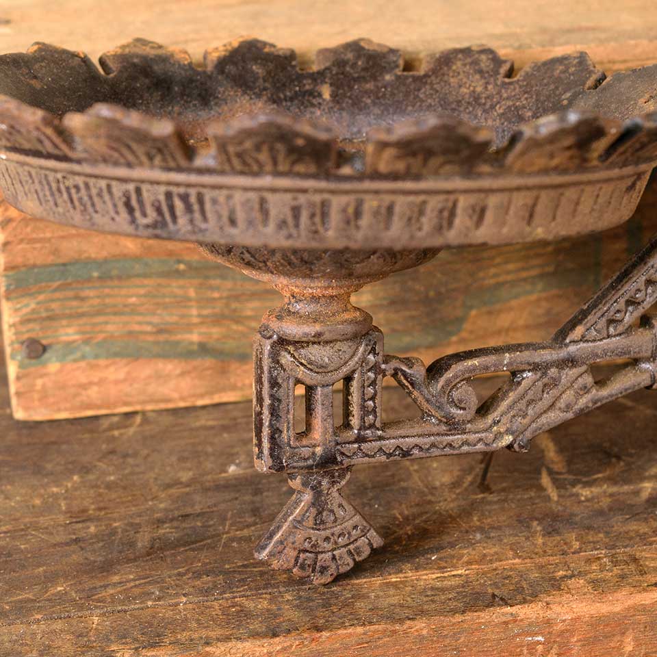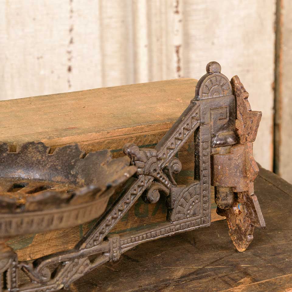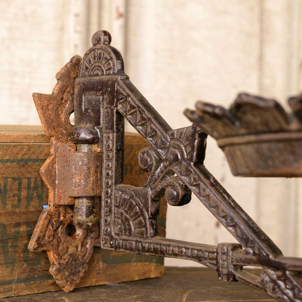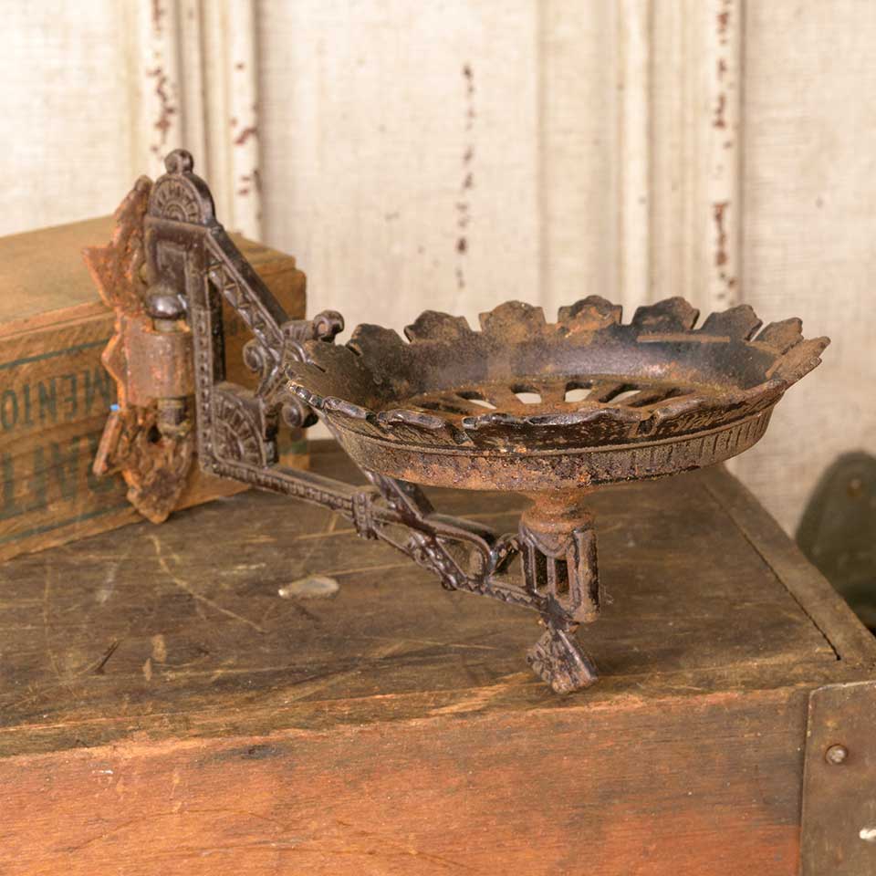 Architectural salvage antique cast iron Victorian Eastlake patterned wall mount oil lamp sconce with wall bracket measuring approx. 5" wide x 4 3/4" tall x 8 5/8" front to back (with bracket). See photos to evaluate condition.