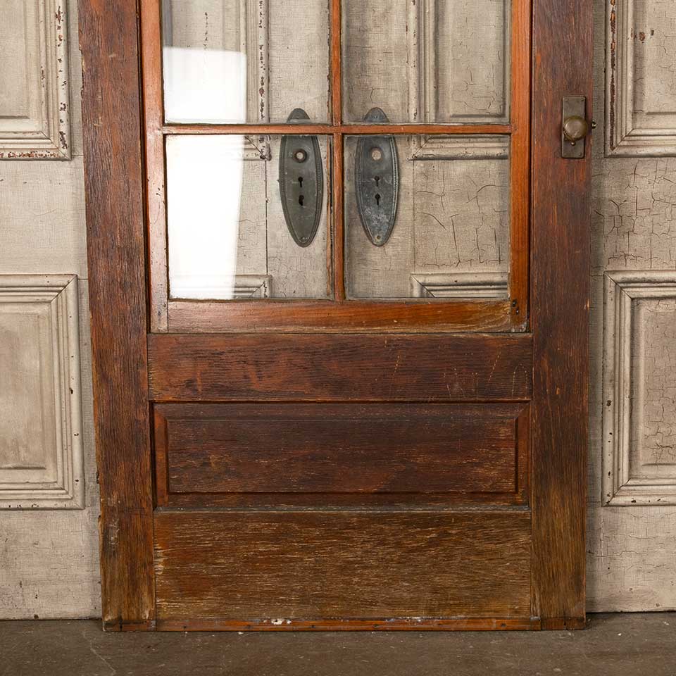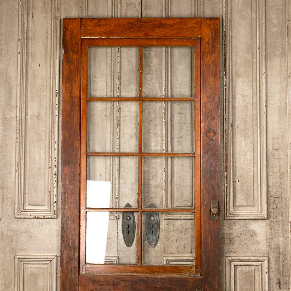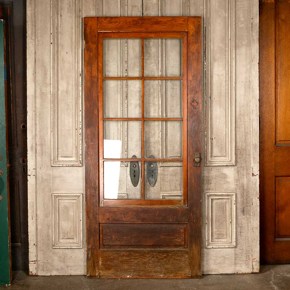 Architectural salvage antique divided nine lite pine wood storm door with handles and latch measuring approx. 35 7/8" wide x 80 7/8" tall x 1 1/8" front to back. See photos to evaluate condition.