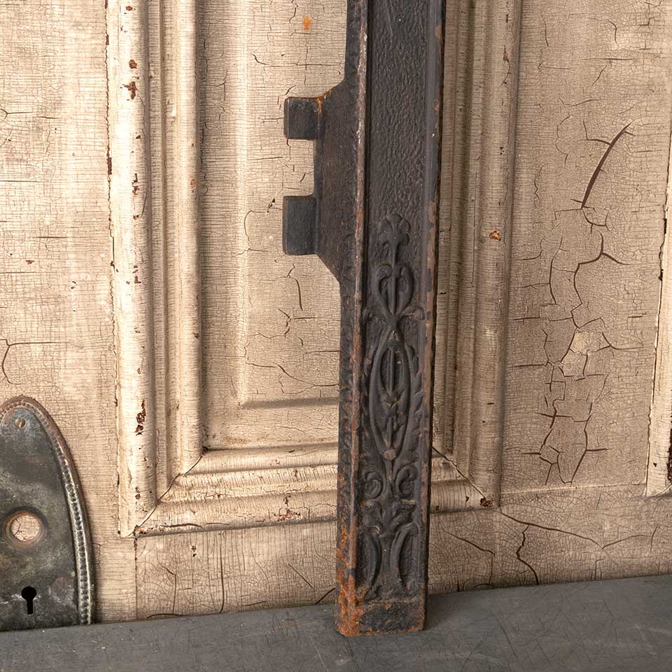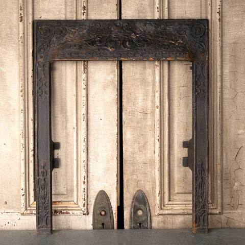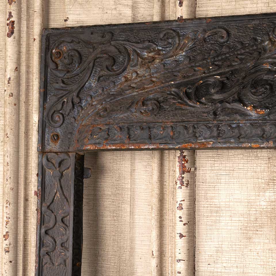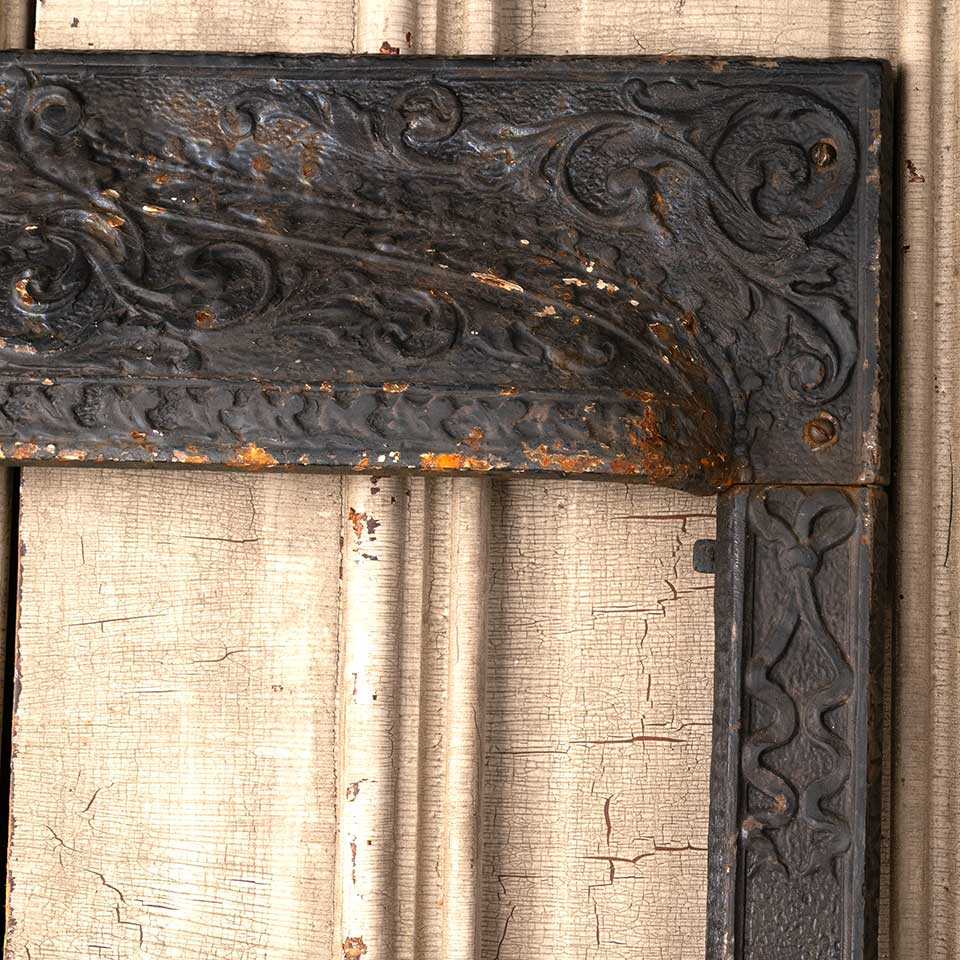 Architectural salvage antique ornate cast iron fireplace surround measuring approx. 24 7/8" wide x 30 1/4" tall x 2 3/4" front to back. The interior firebox opening measures approx. 20" wide x 24 1/4" tall. See photos to evaluate condition.