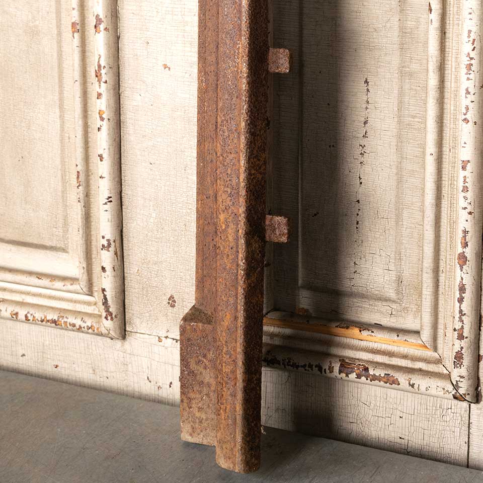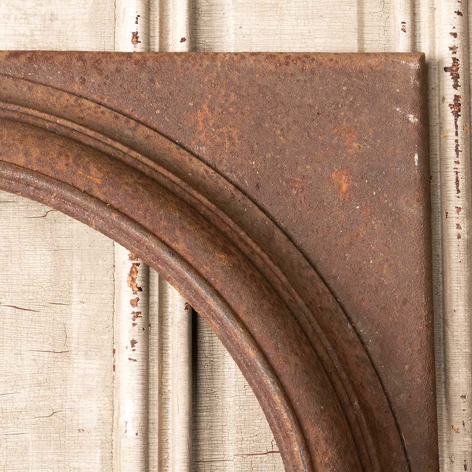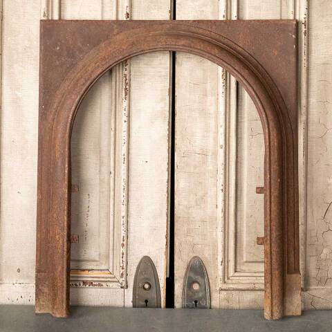 Architectural salvage antique ornate cast iron fireplace surround with arched top opening measuring approx. 28" wide x 31 5/8" tall x 3" front to back. The interior firebox opening measures approx. 20" wide x 27 3/4" tall. There's surface rusty and pitting. See photos to evaluate condition.