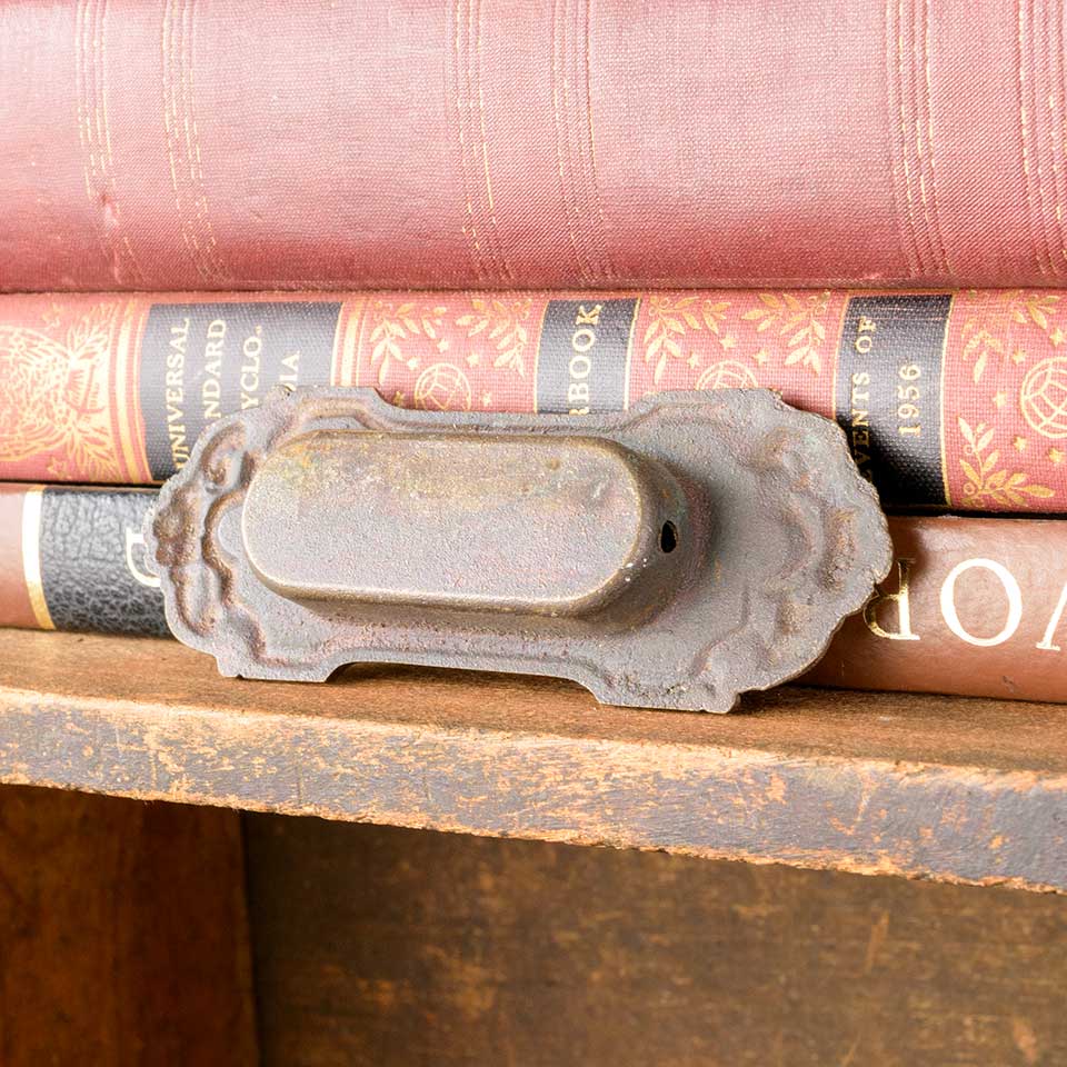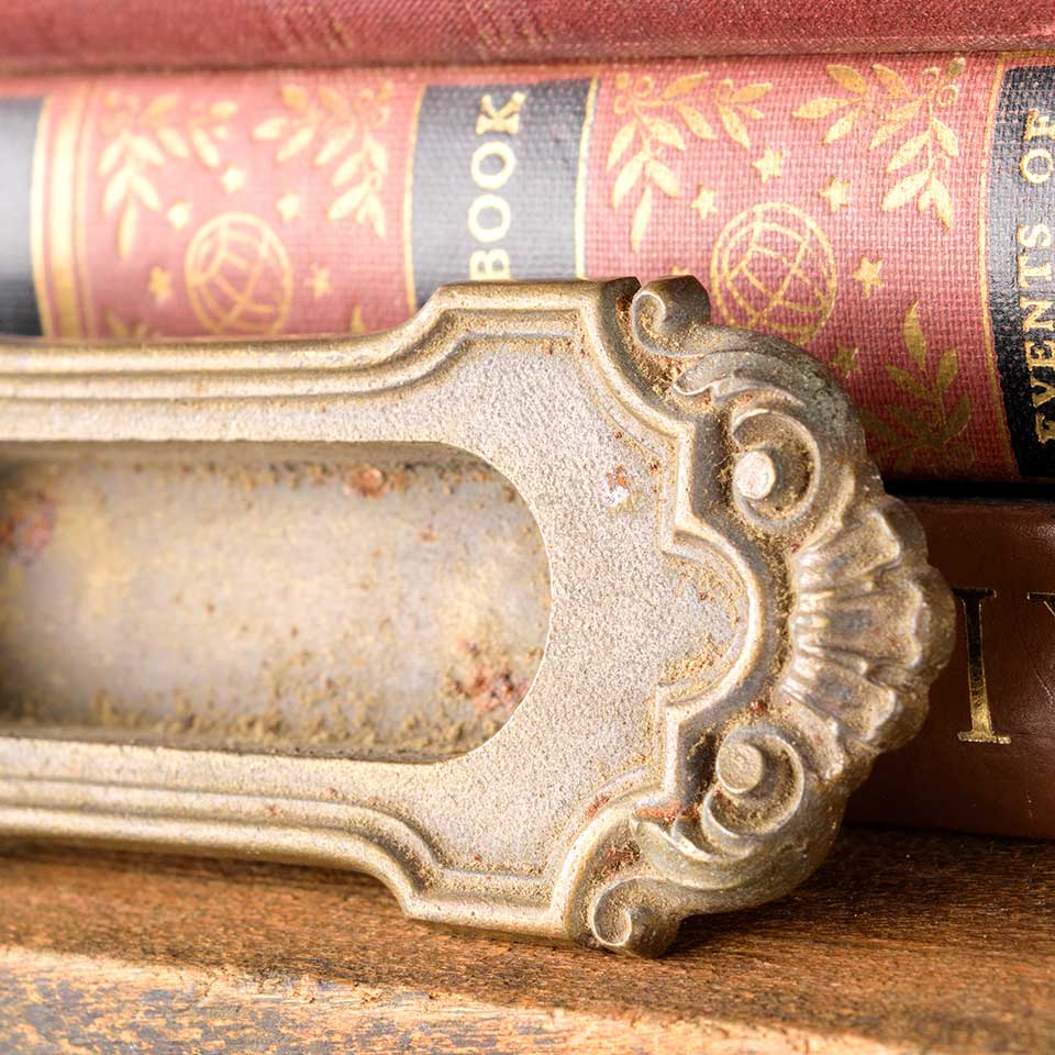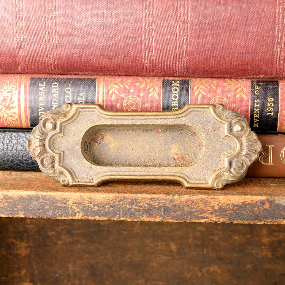 Architectural salvage antique ornate cast iron window sash lift hardware measuring approx. 4 1/2" wide x 1 1/2" tall x 5/8" front to back. The recessed area measures approx. 2 1/4" wide x 13/16" tall. See photos to evaluate condition.