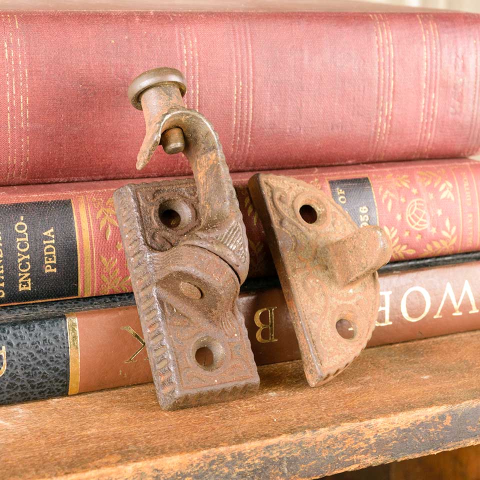 Architectural salvage antique Payson ornate cast iron and bronze window sash lock with a patent date of 1876. The lock measures approx. 3 1/4" wide x 1 1/8" tall x 1" front to back and the keeper 2 1/4" wide x 1 1/8" tall x 1 1/4" front to back. Color and condition may vary.