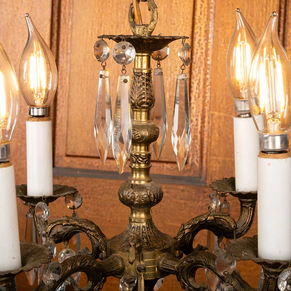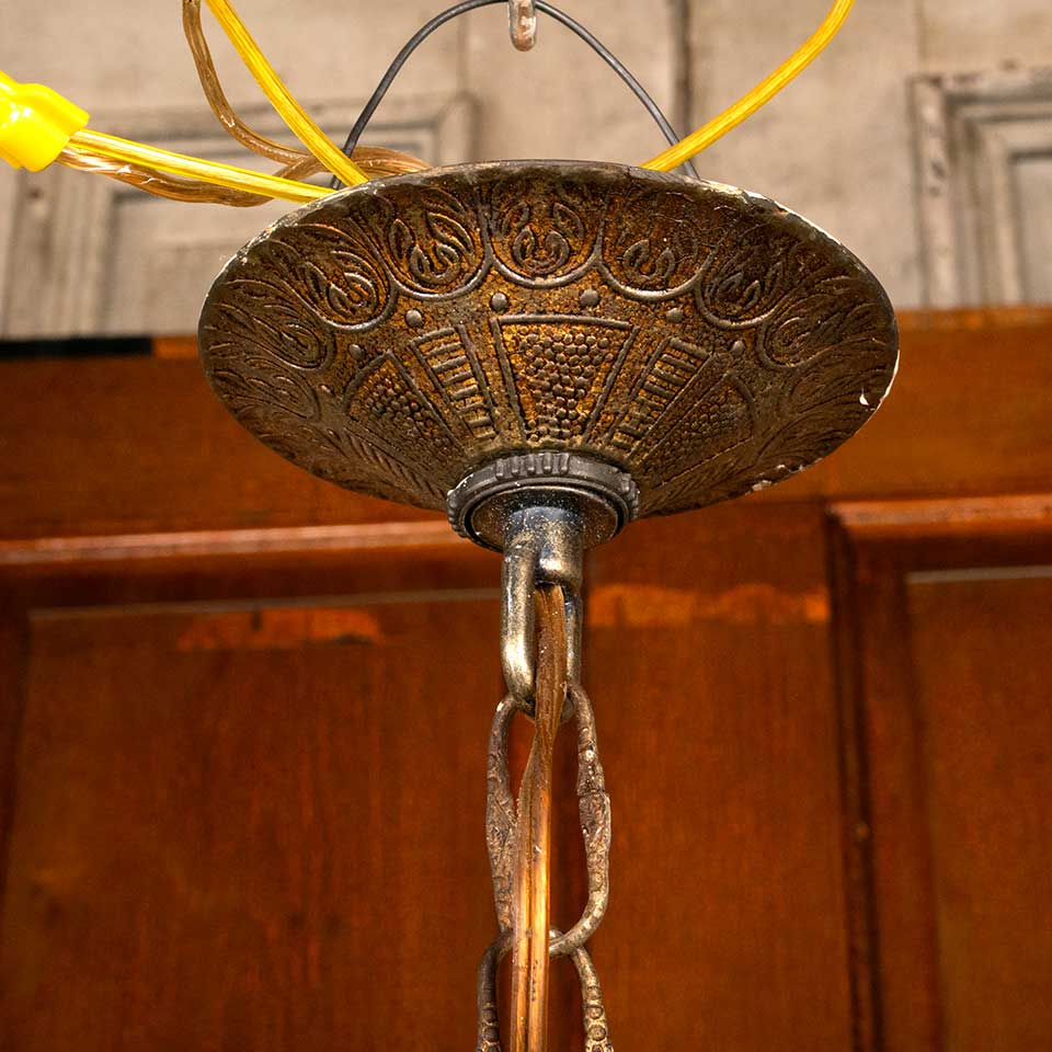Architectural salvage antique four bulb brass chandelier light fixture with glass prisms measuring approx. 13" in diameter x 27 1/2" tall (overall) with a 4 1/2" diameter ceiling canopy. See photos to evaluate condition. Salvaged lighting should be inspected by a licensed electrician prior to installation.