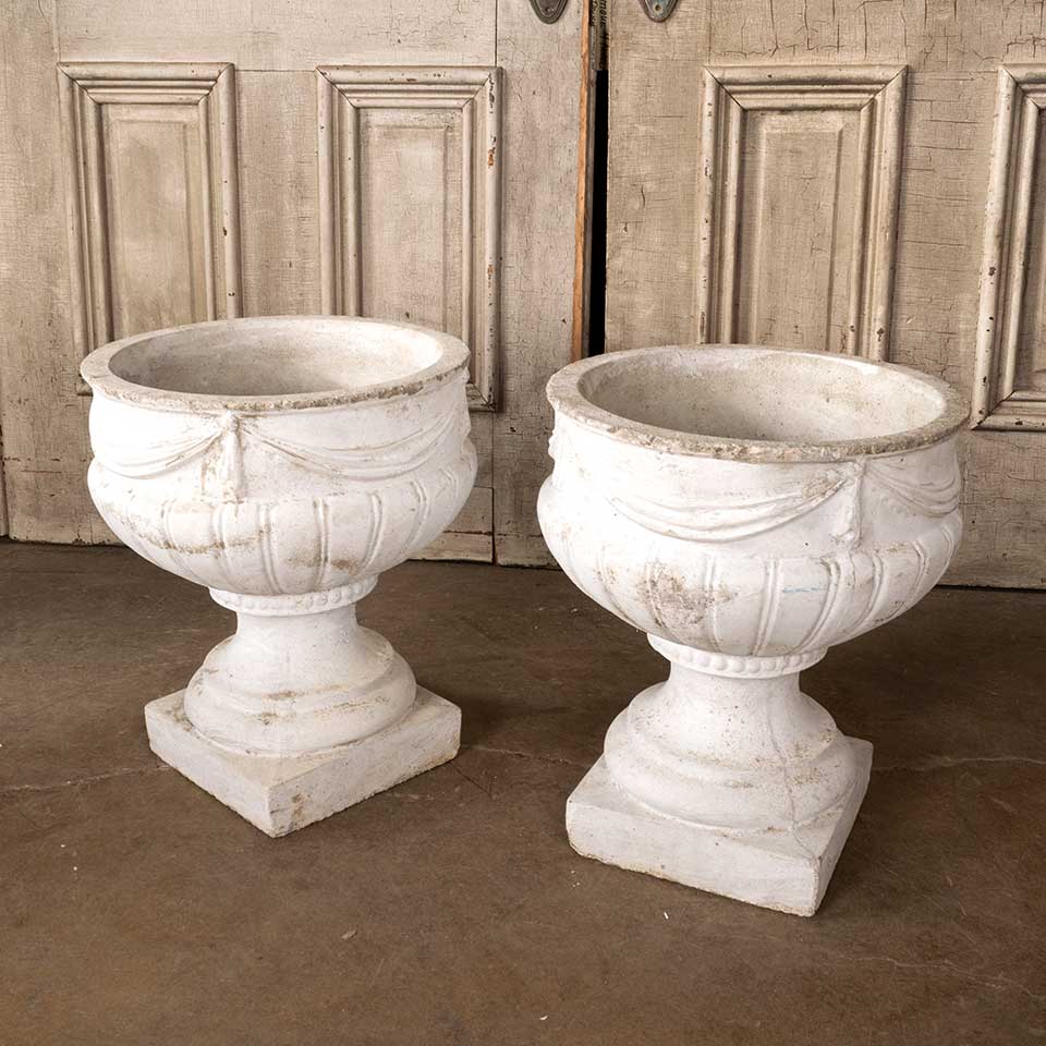 Pair of architectural salvage vintage cast concrete garden urn planters with swag motif each measuring approx. 14 1/2" diameter x 16 1/2" tall with a 9" x 9" square base. See photos to evaluate condition. Priced at $525 for the pair.