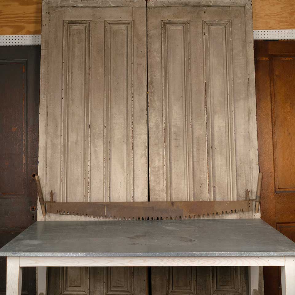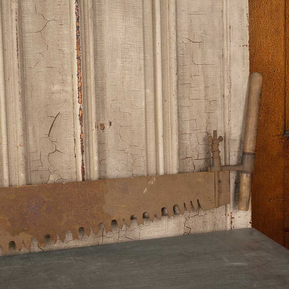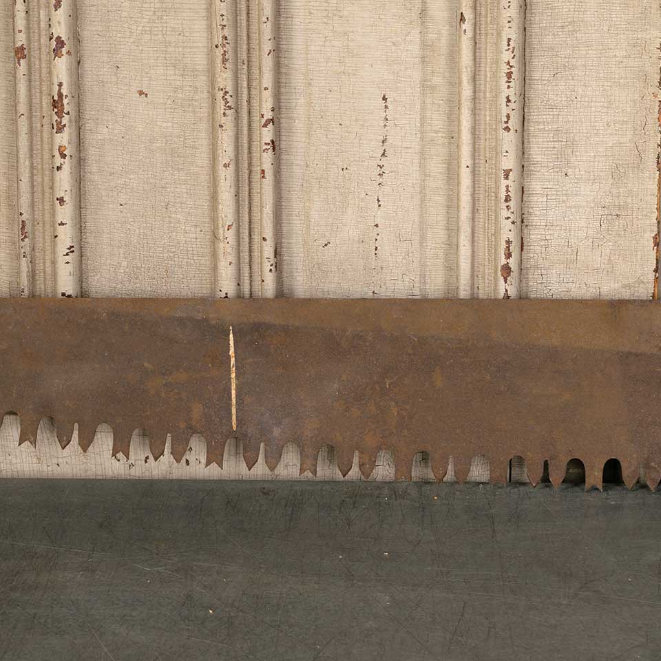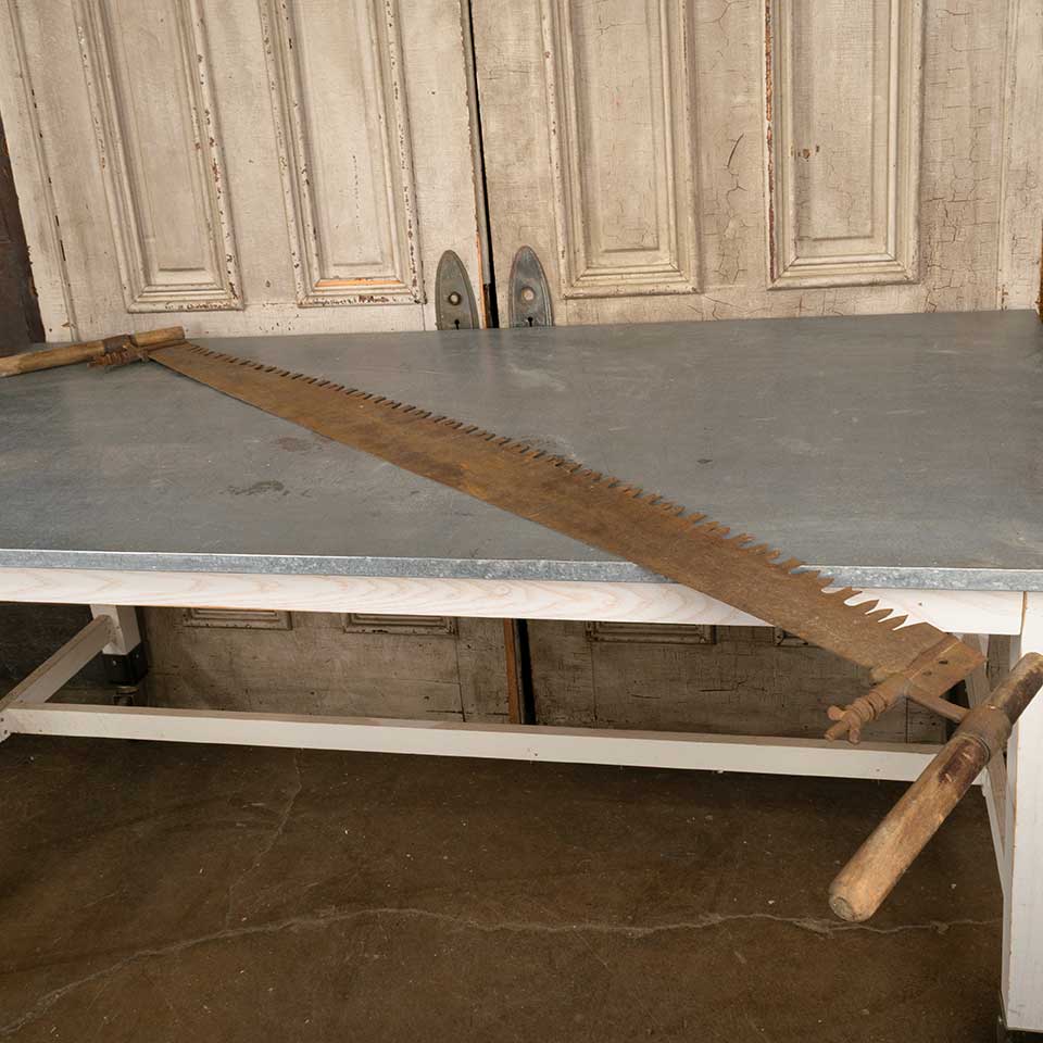 Antique large two man lumberjack crosscut "misery whip" wood saw measuring approx. 74 1/2" long x 15" tall x 1 1/4" wide. See photos to evaluate condition.