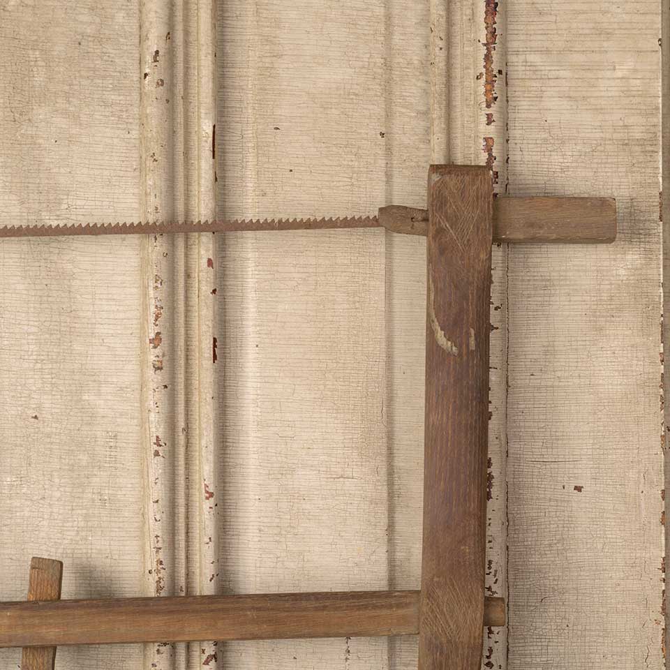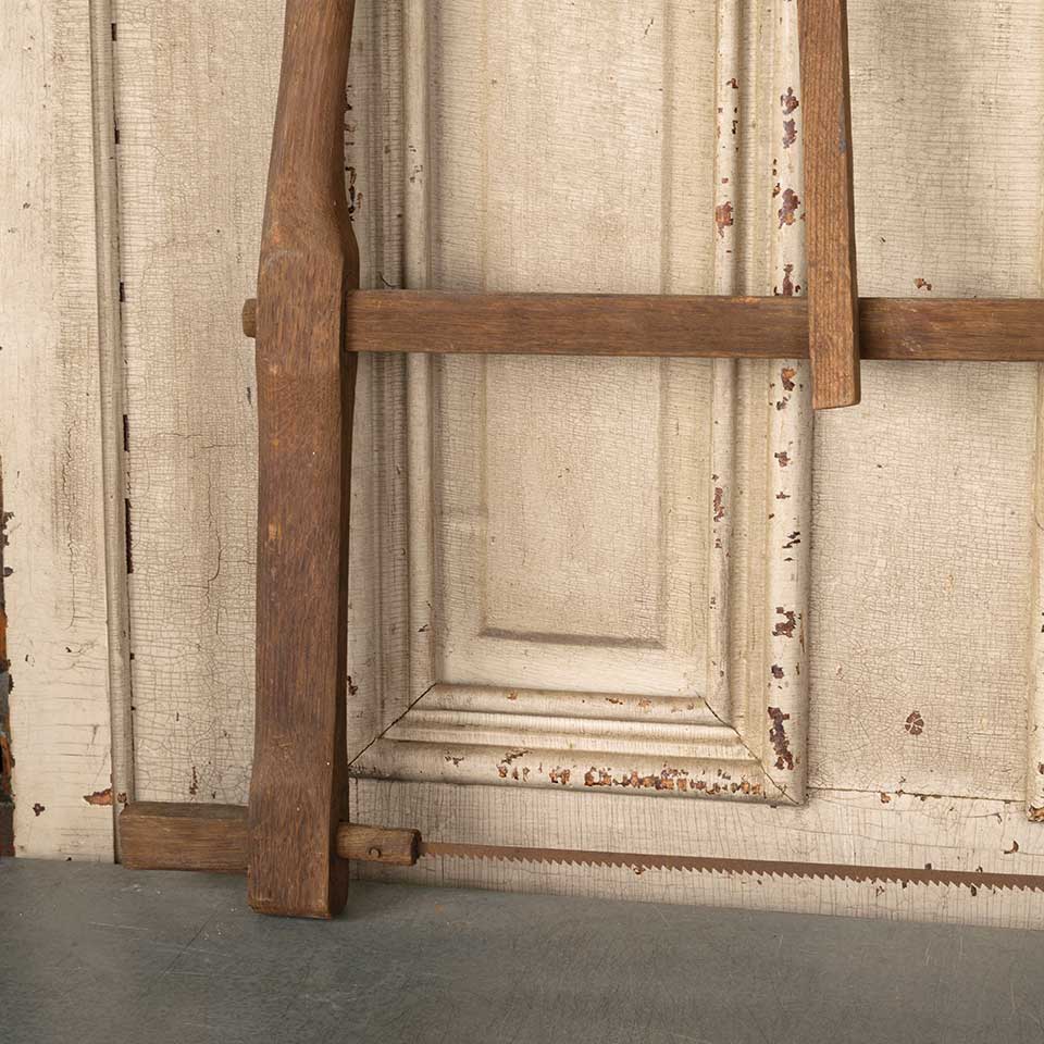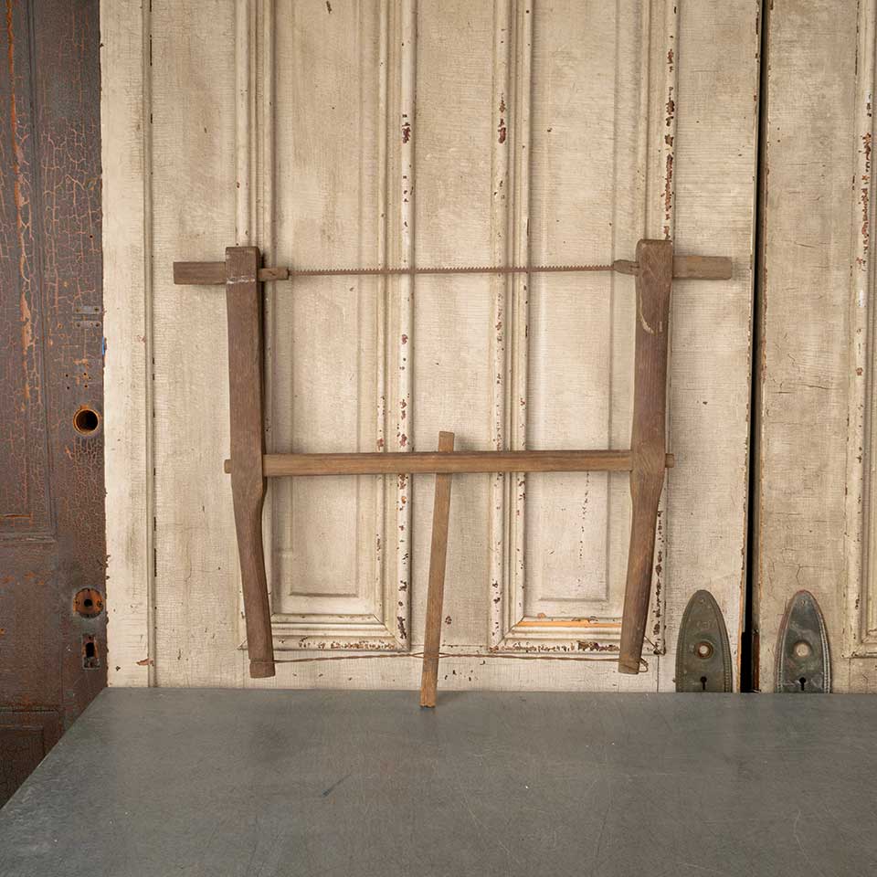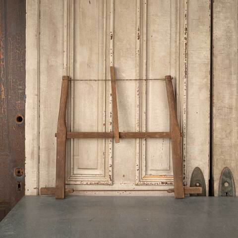 Antique primitive oak buck bow wood cutting handsaw measuring approx. 30 1/8" long x 23 1/4" tall x 1 3/8" thick. See photos to evaluate condition.