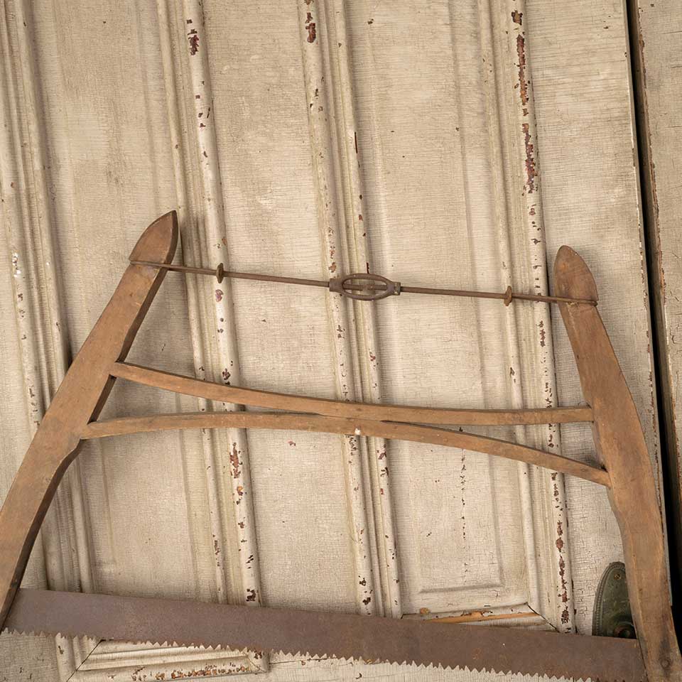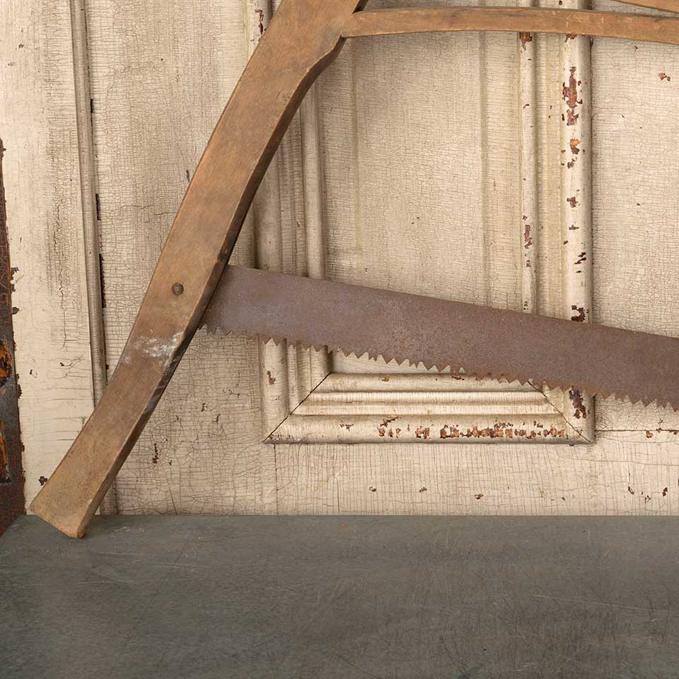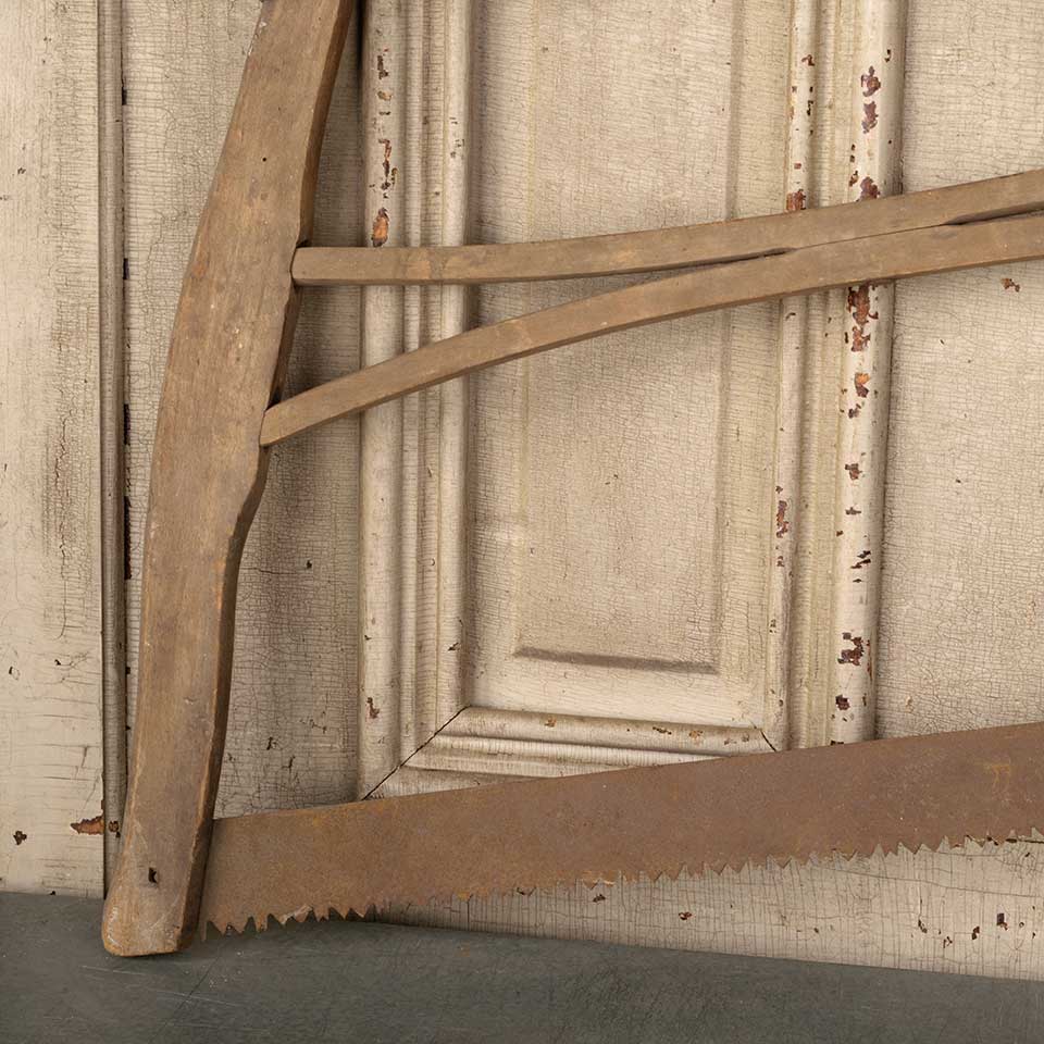 Antique primitive oak buck bow wood cutting handsaw measuring approx. 34 1/4" long x 25 1/4" tall x 1" thick. See photos to evaluate condition.