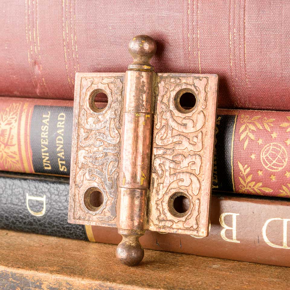 Architectural salvage antique ornate metal door hinge hardware with ball finials measuring approx. 2" x 2" (2 7/8" tall including finials). Color and condition may vary.