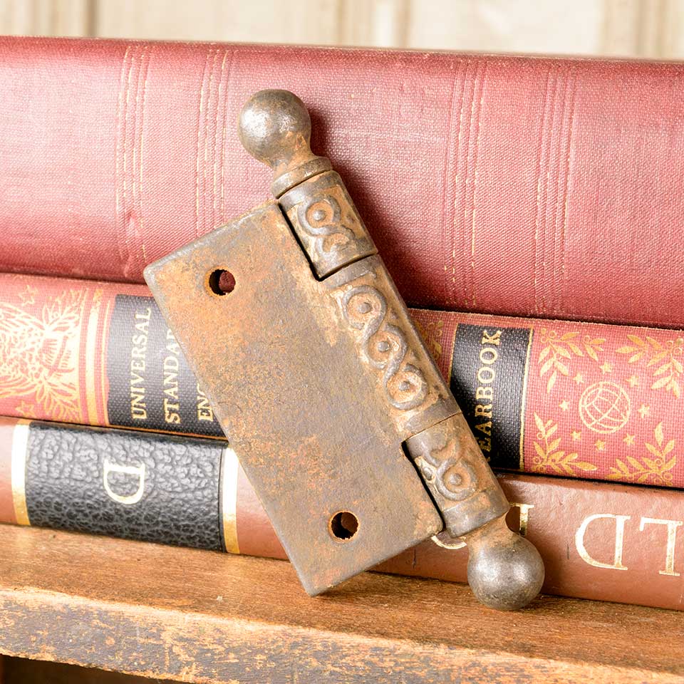 Architectural salvage antique ornate cast iron door hinge hardware with ball finials measuring approx. 2 1/2" x 2 1/2" (3 7/8" tall including finials). See photos to evaluate condition.