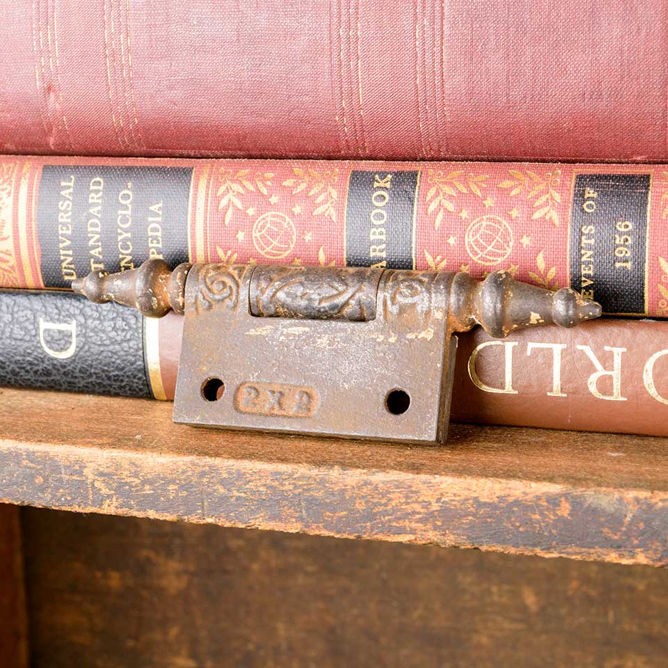 Architectural salvage antique ornate cast iron door hinge hardware with steeple finials measuring approx. 2" x 2" (4" tall including finials). See photos to evaluate condition.