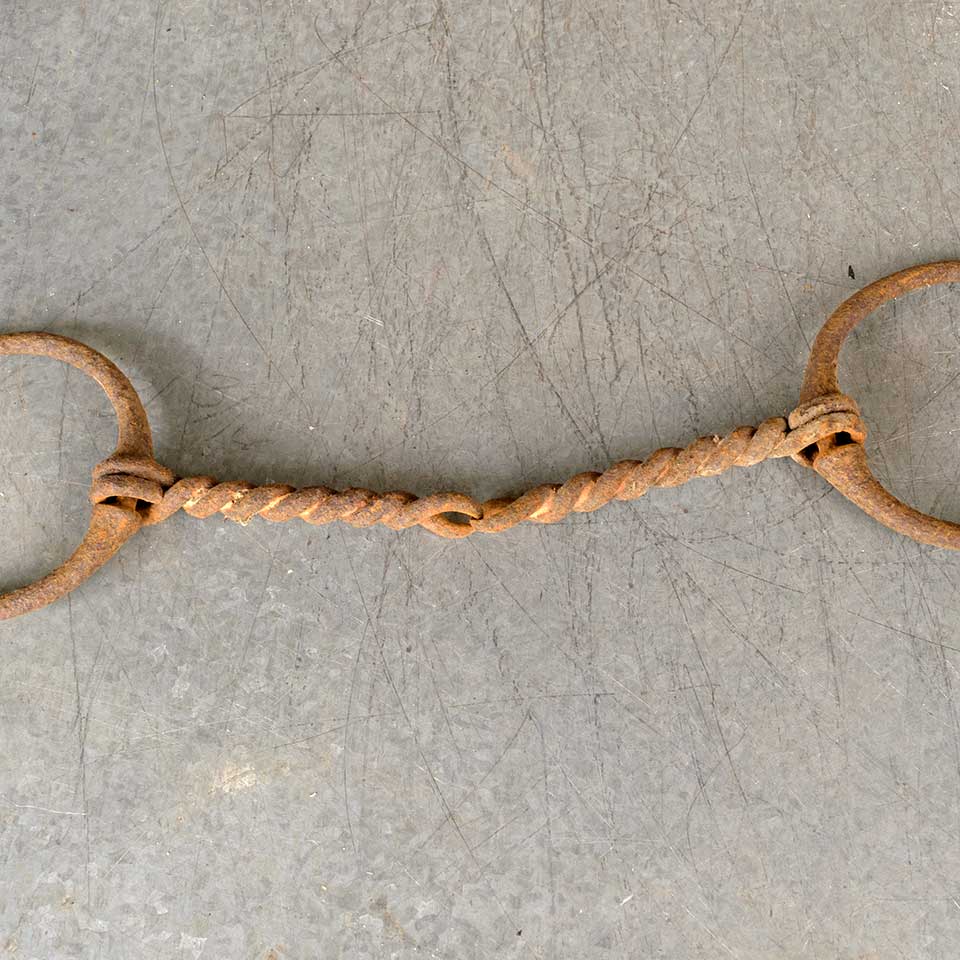 Antique wrought iron snaffle bit for horse riding bridle reins with a 6" mouthpiece and 3" diameter rings. Color and condition vary.