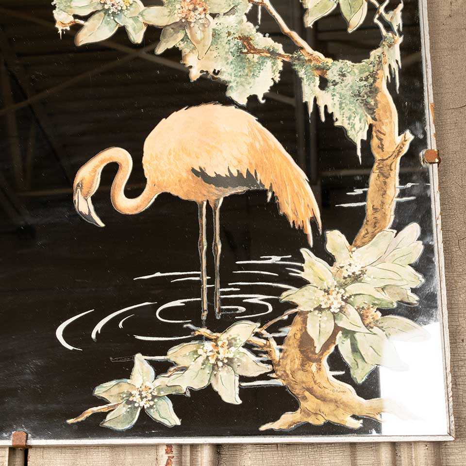 Architectural salvage vintage mid century modern wall mirror with pink flamingo motif measuring approx. 30" wide x 20" tall x 1" front to back. The decoration has a three dimensional effect. See photos to evaluate condition.
