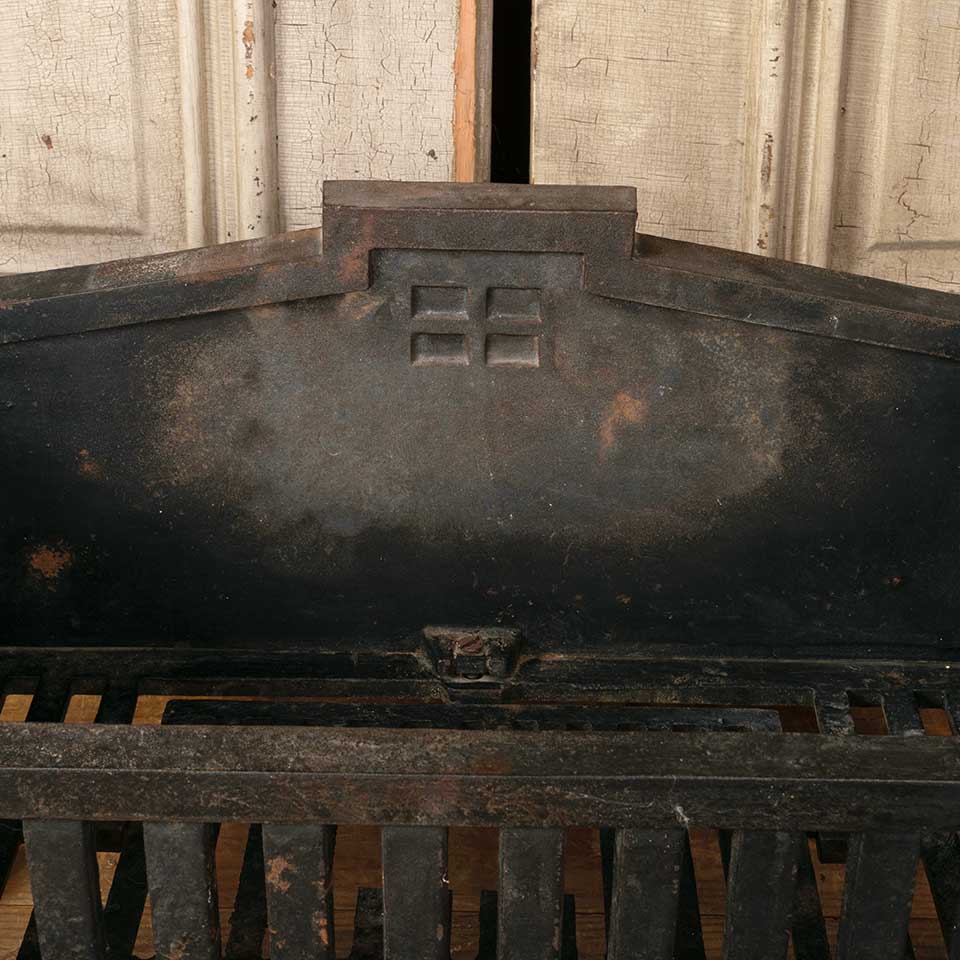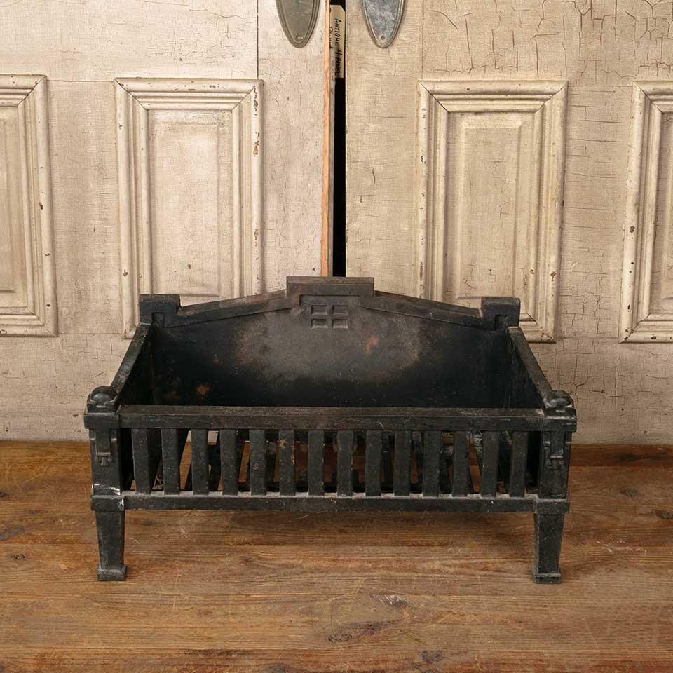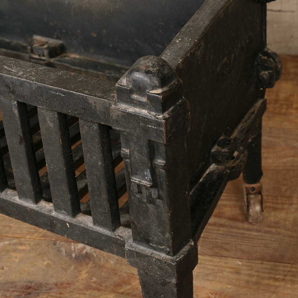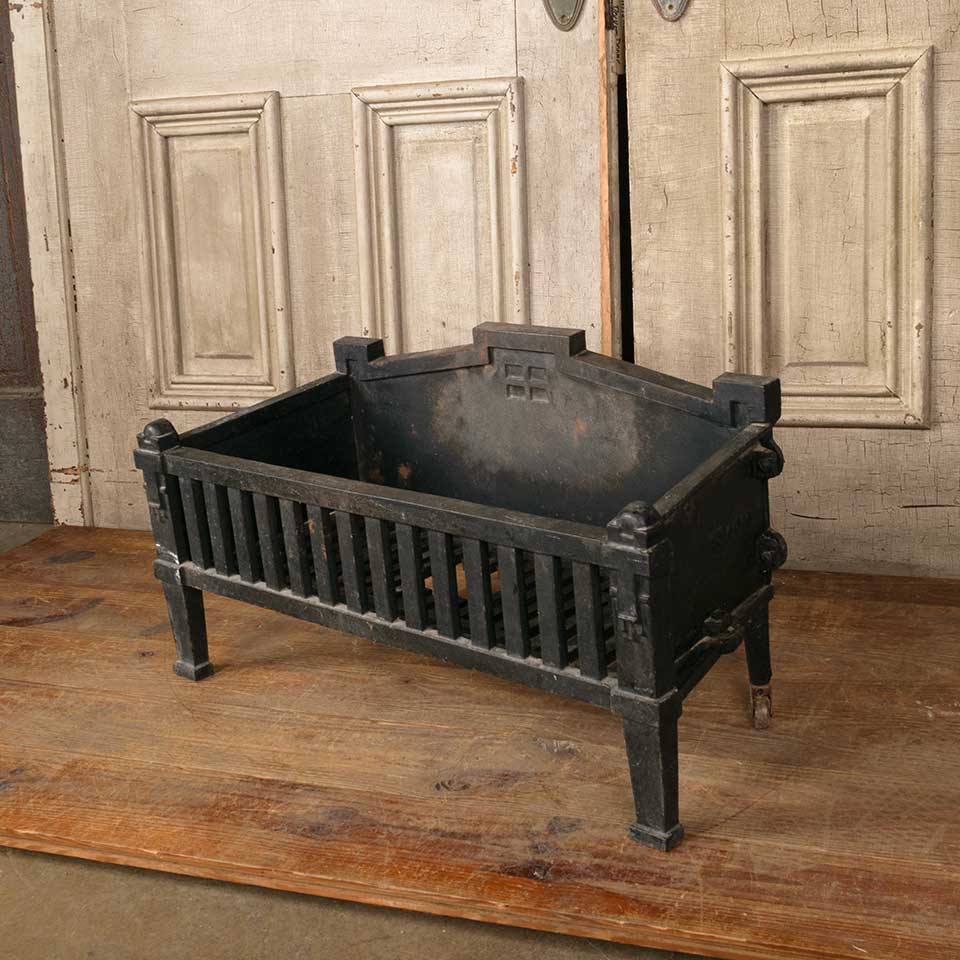 Architectural salvage antique cast iron fireplace log holder with pivoting ash panel measuring approx. 26 1/2" wide (at front) x 14 5/8" tall (at back) x 11 1/4" front to back. See photos to evaluate condition.