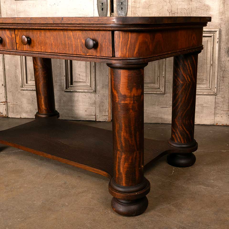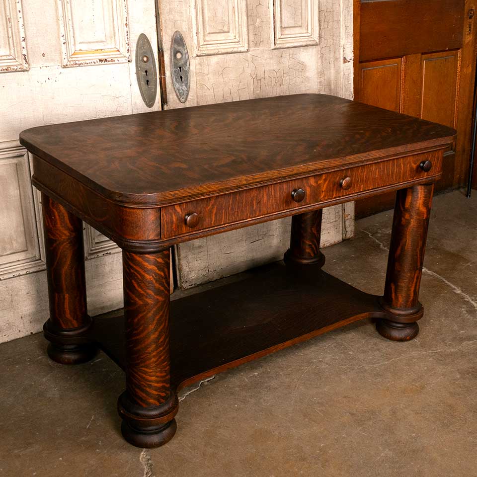 Antique quarter sawn oak library table with drawer measuring approx. 48" wide x 29" tall x 28" front to back. There's a piece of veneer missing on the back of the bottom support piece. See photos to evaluate condition.