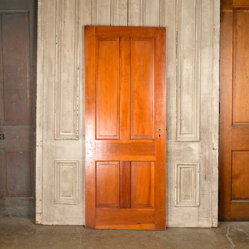 Architectural salvage antique pine wood four panel interior door with mortise lock measuring approx. 31 3/4" wide x 79 3/4" tall x 1 3/8" thick. One of the upper panels has a vertical crack. See photos to evaluate condition.