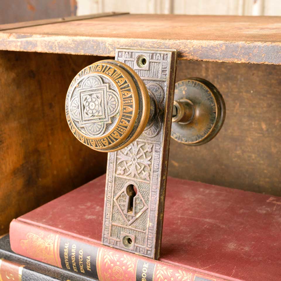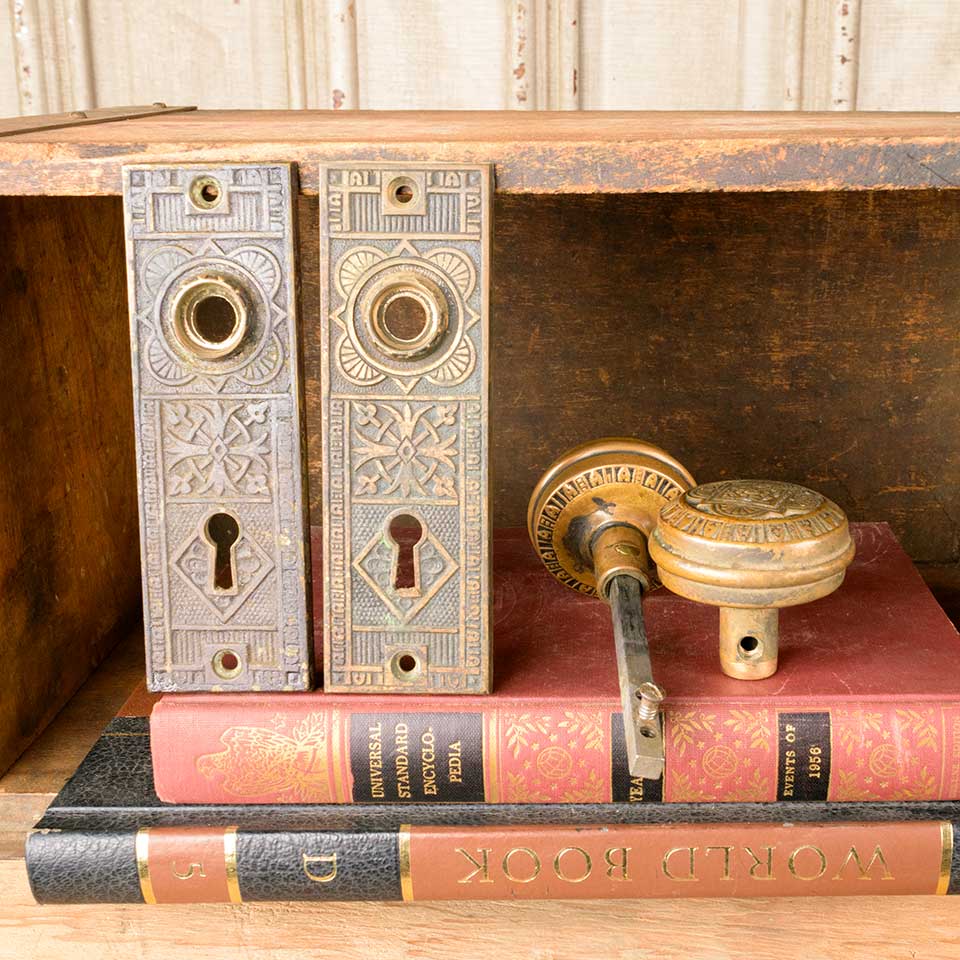 Architectural salvage antique cast brass Sargent c. 1885 door hardware set. The set includes two 2 1/4" diameter doorknobs, two 1 3/4" wide x 5 1/4" tall x 1/8" thick backplates, and a tapped spindle with set screws. Color and condition may vary. Priced at $225/set.