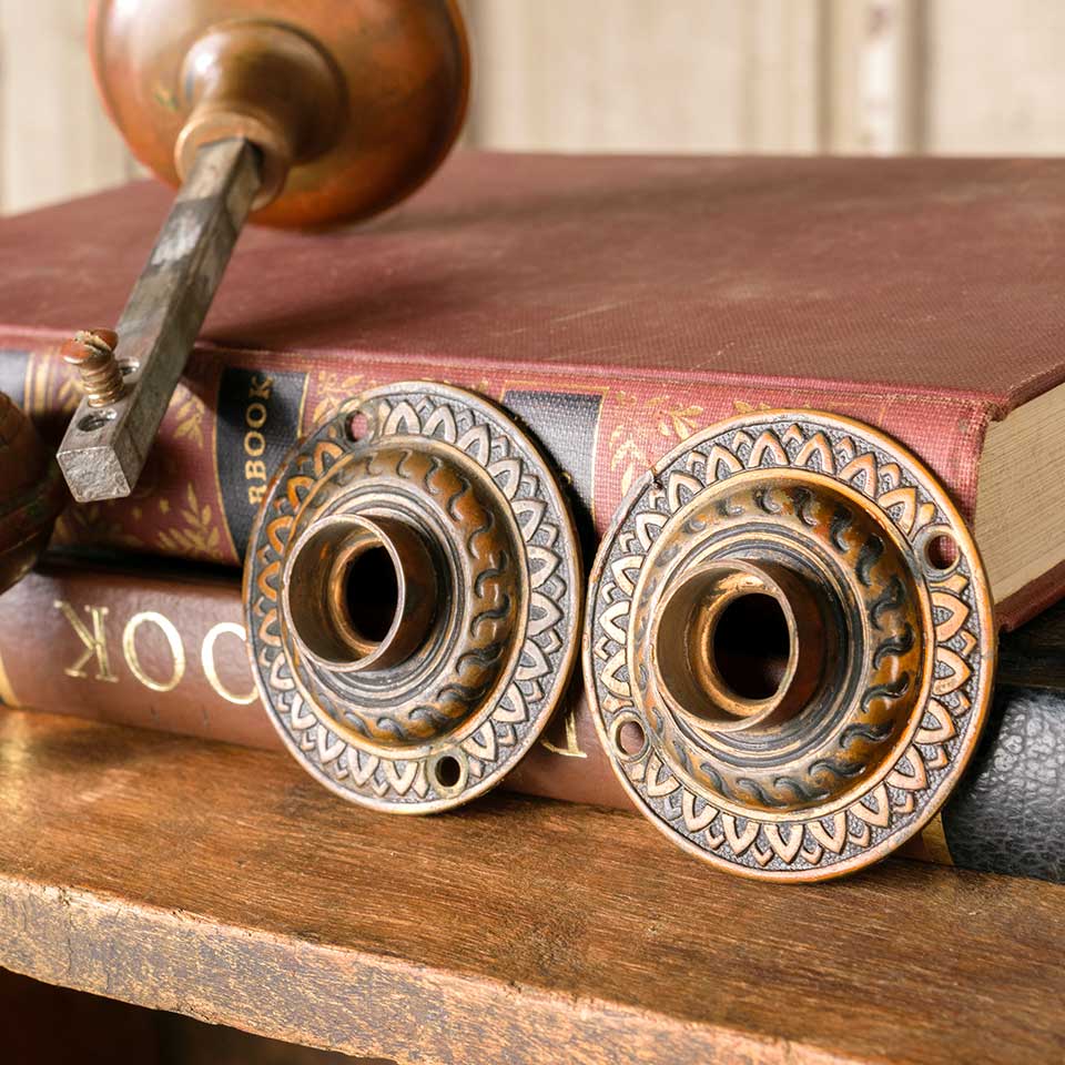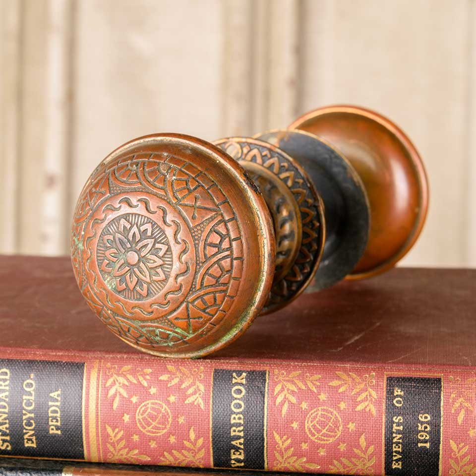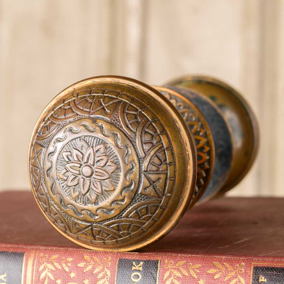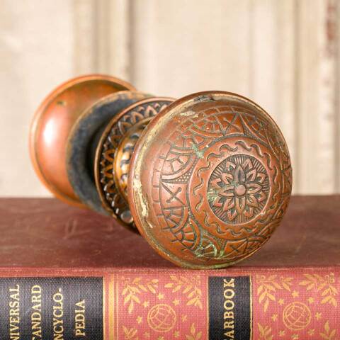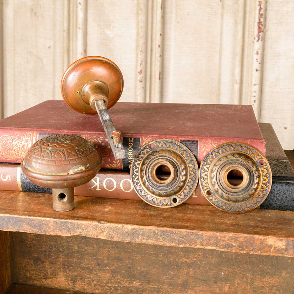 Architectural salvage antique Victorian Reading Hardware Company Windsor pattern c. 1890 doorknob hardware set. The set includes a pair of 2 1/4" diameter doorknobs, a pair of 2" diameter doorknob rosette backplates, and a tapped spindle with set screws. Color and condition may vary. Priced at $225 for the set.
