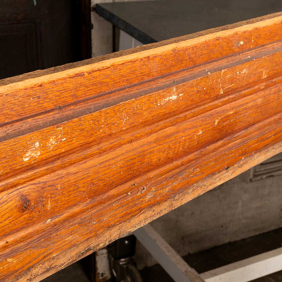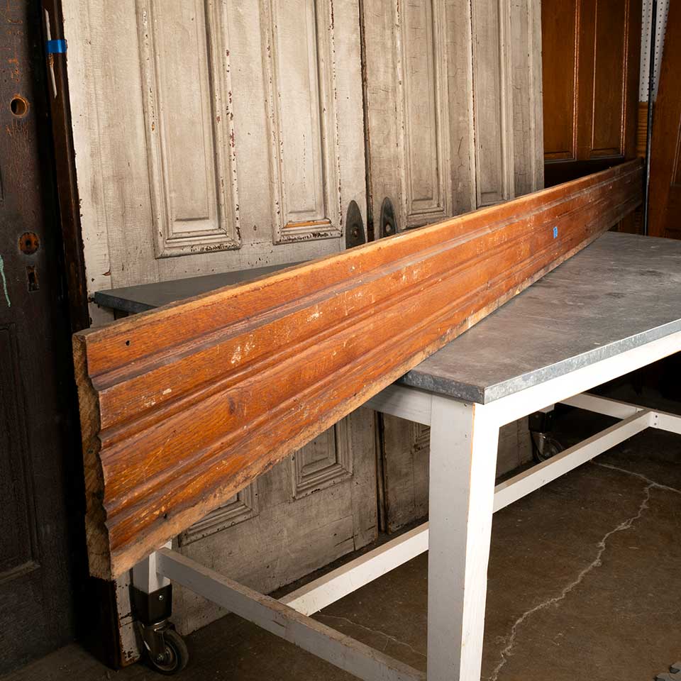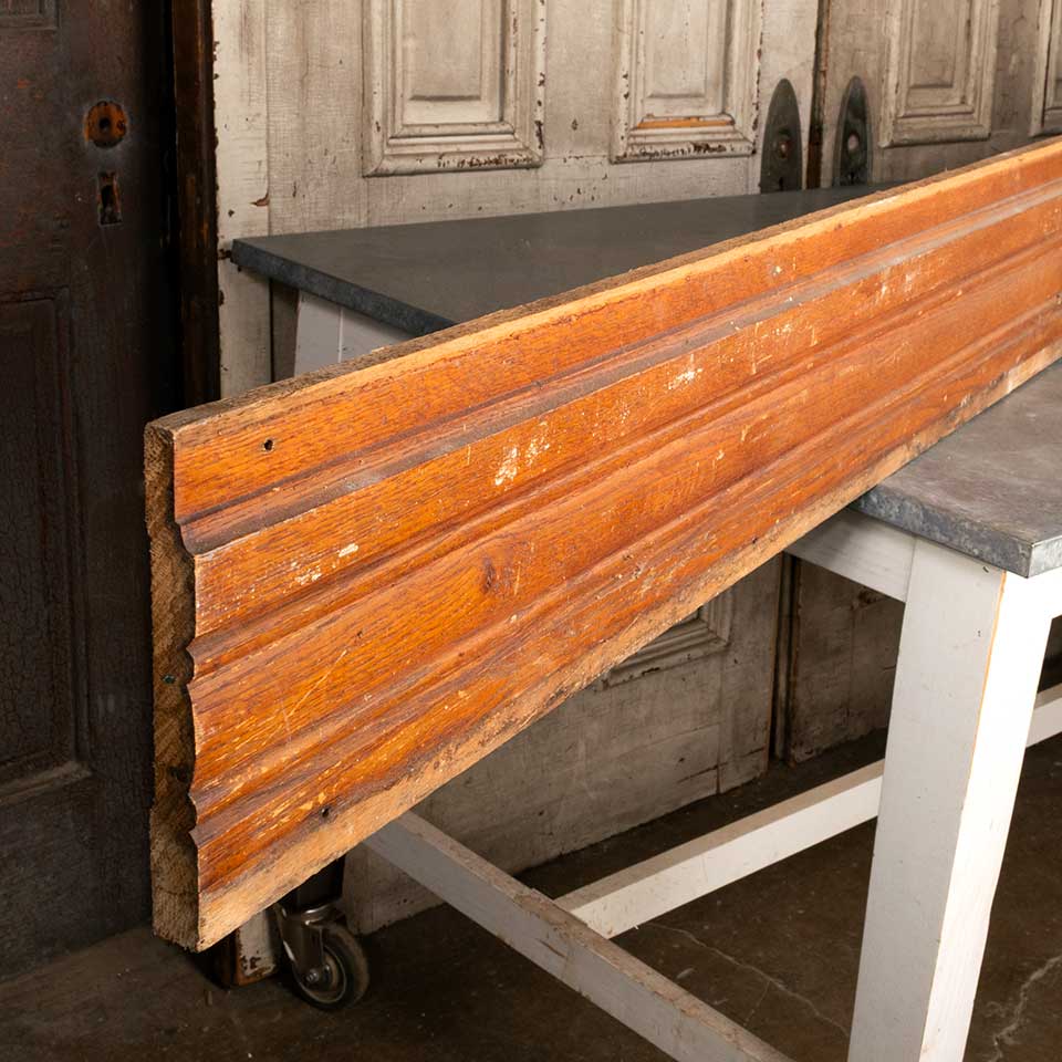 Architectural salvage unpainted antique oak wood baseboard trim measuring approx. 7 3/4" tall x 7/8" thick. Quantities, lengths and prices as follows: 1 @ 151" ($113.25); 2 @ 157" ($117.75). Color and condition may vary.