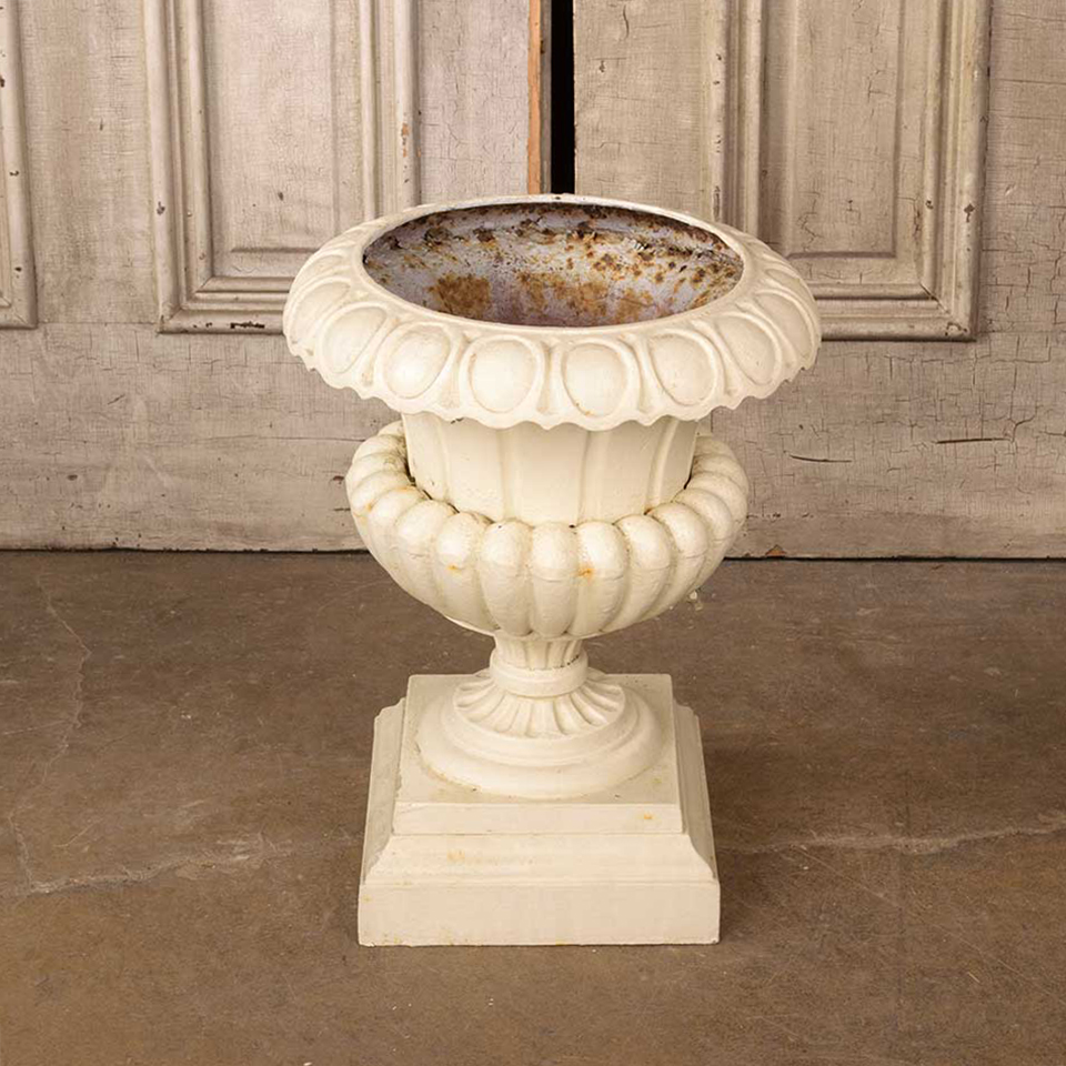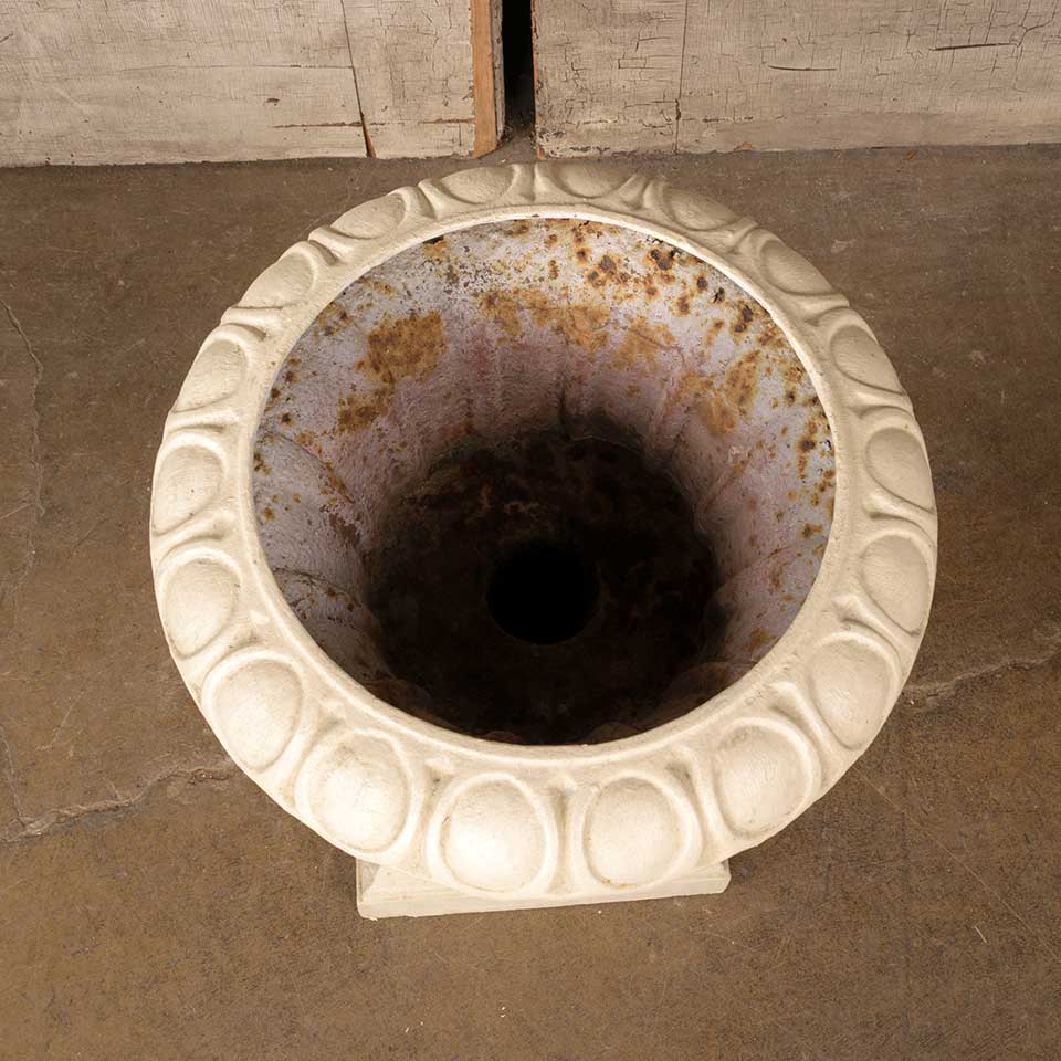 Architectural salvage antique four piece cast iron garden urn planter measuring approx. 15" diameter x 19 1/4" tall with a 10 1/4" x 10 1/4" base. See photos to evaluate condition.