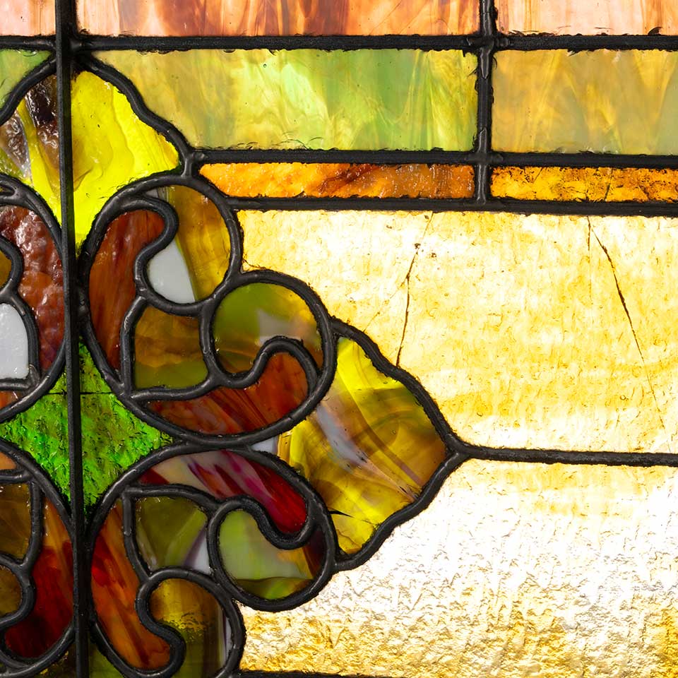 Architectural salvage antique stained glass window measuring approx. 34" wide x 21" tall x 1 3/8" front to back. There are some cracks, but no glass loss. See photos to evaluate condition.