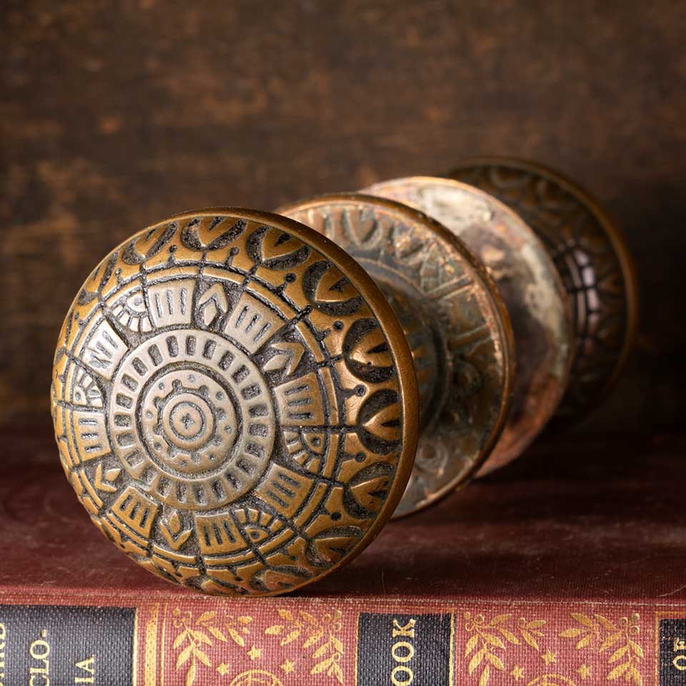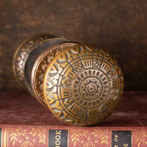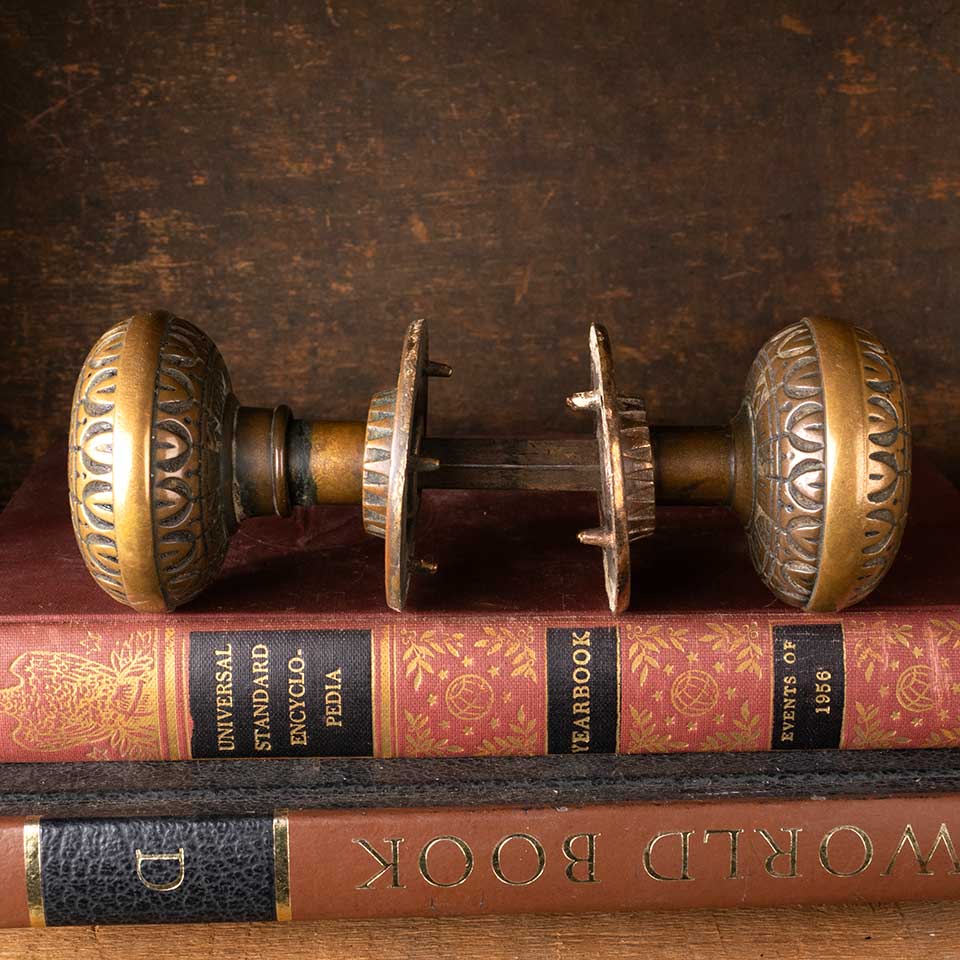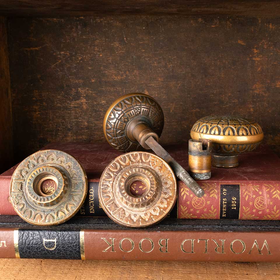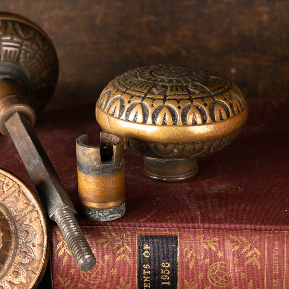 Architectural salvage antique Victorian Peterborough Lock Company (circa 1887) ornate brass doorknobs door hardware set including two matching doorknobs (2 1/4" in diameter), two matching doorknob rosettes (2 1/8" in diameter), and a fixed / threaded doorknob spindle with a sleeve. See photos to evaluate condition. Priced at $250 for the set.