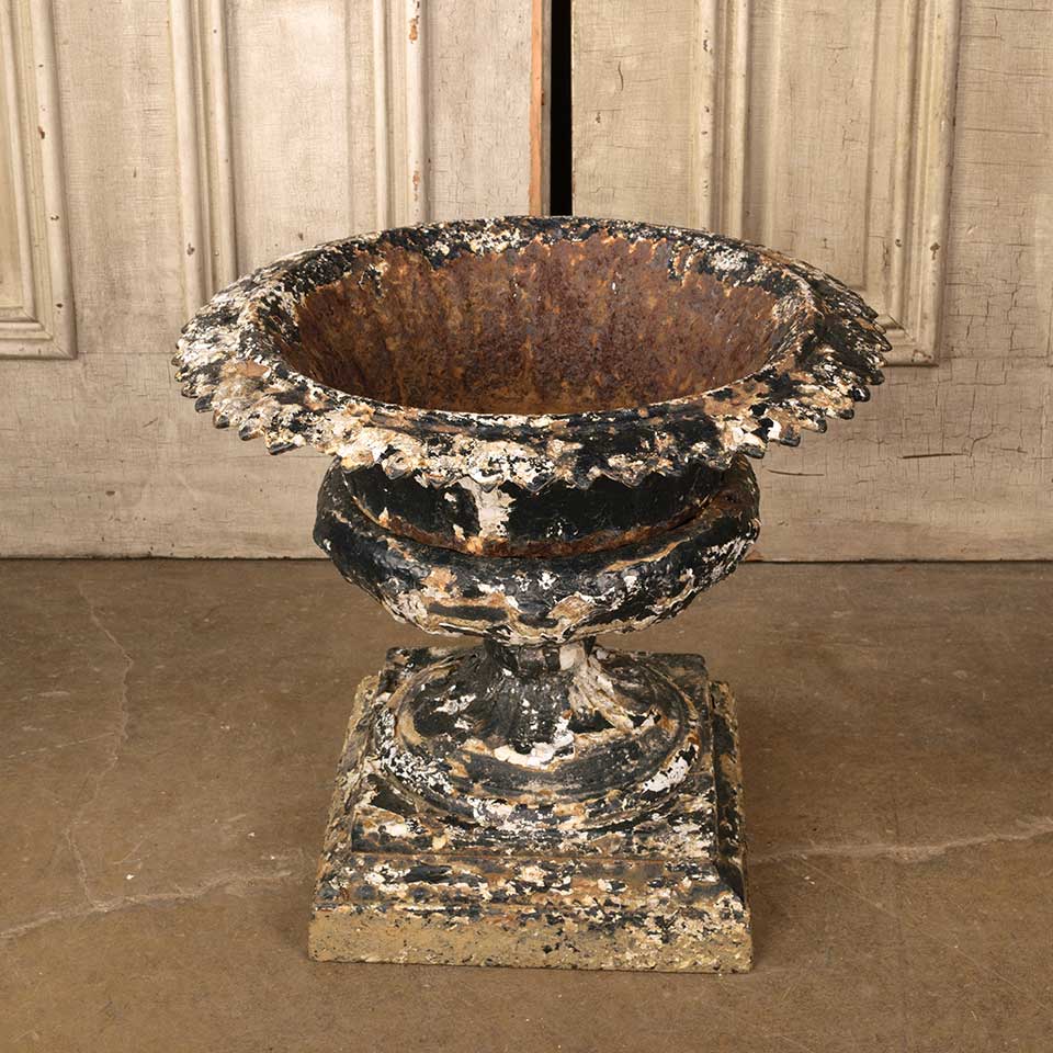 Architectural salvage antique four piece cast iron garden urn planter measuring approx. 21" diameter x 19 1/2" tall with a 13 1/2" x 13 1/2" base. See photos to evaluate condition.